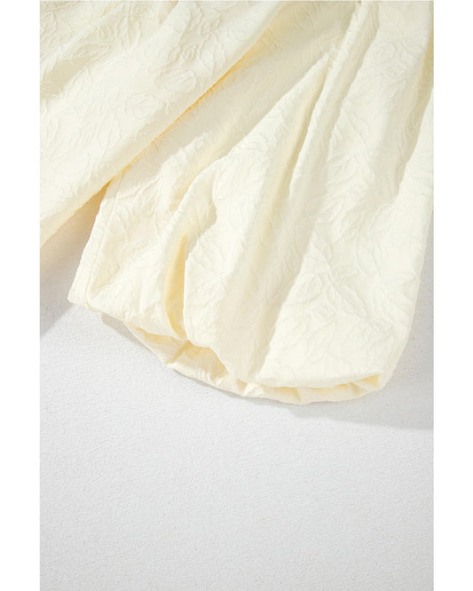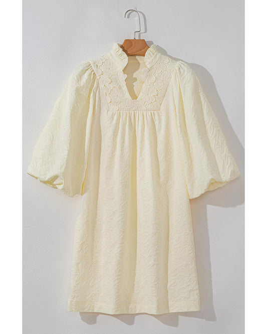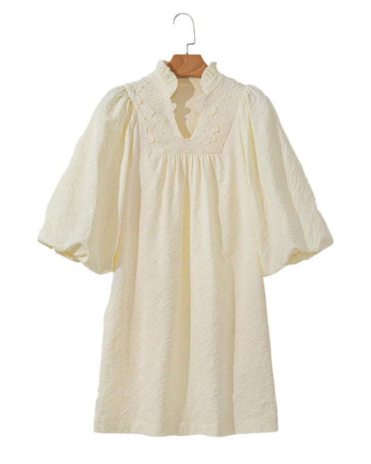 Women's Floral Textured Bubble Sleeve Frilled Notched Neck Dress