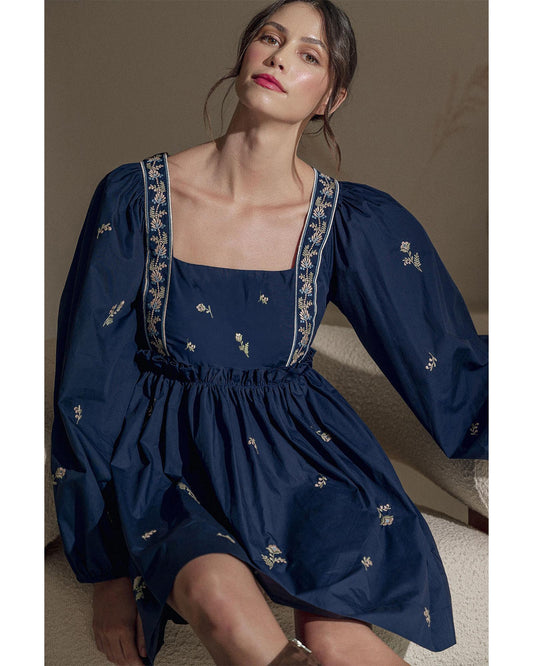 Blue Floral Embroidered Square Neck Puff Sleeve Ruffled Mini Dress