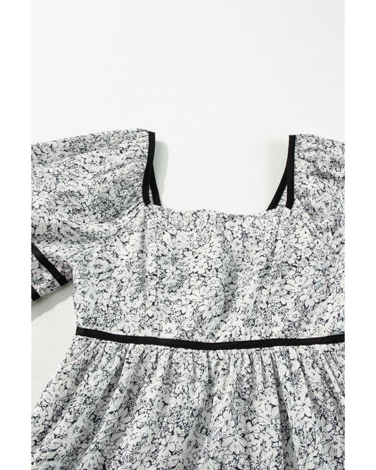 Gray Floral Print Open Back Balloon Sleeve Square Neck Mini Dress - L