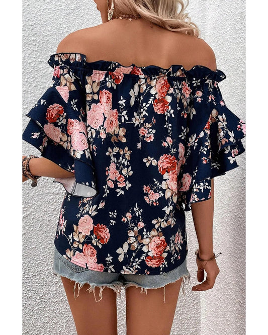Ruffle Off Shoulder Flounce Sleeve Floral Blouse