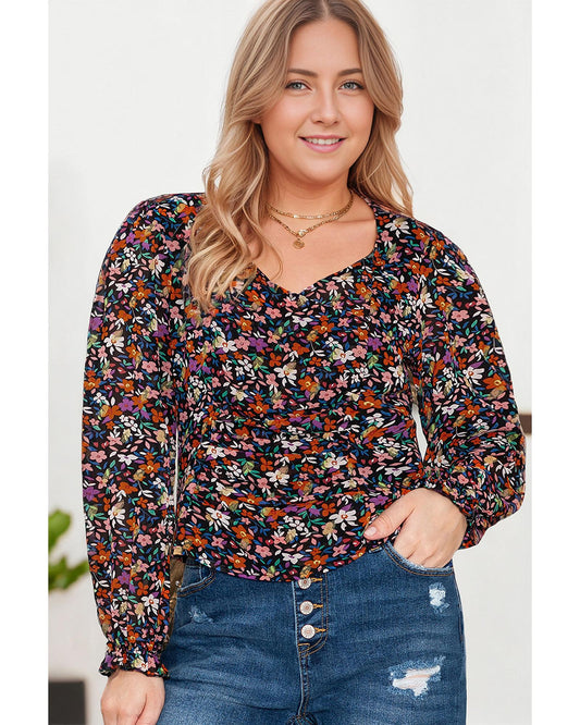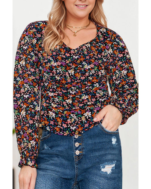 PLUS SIZE V-Neck Bubble Sleeve Floral Blouse
