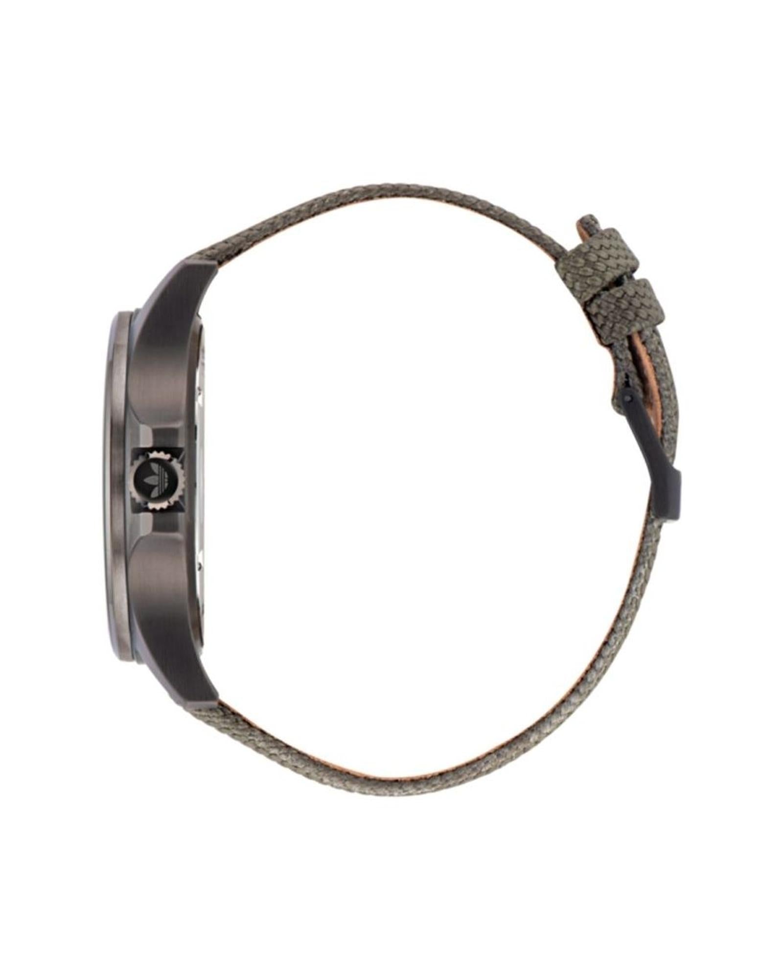 This Adidas Green Fabric Watch features a quartz mechanism with an analog display. Its 44mm green stainless steel case and matching fabric strap offer a stylish and comfortable fit. The mineral glass and 5ATM water resistance add durability, making it suitable for everyday wear. Designed as a unisex accessory, it closes securely with a buckle for convenience.