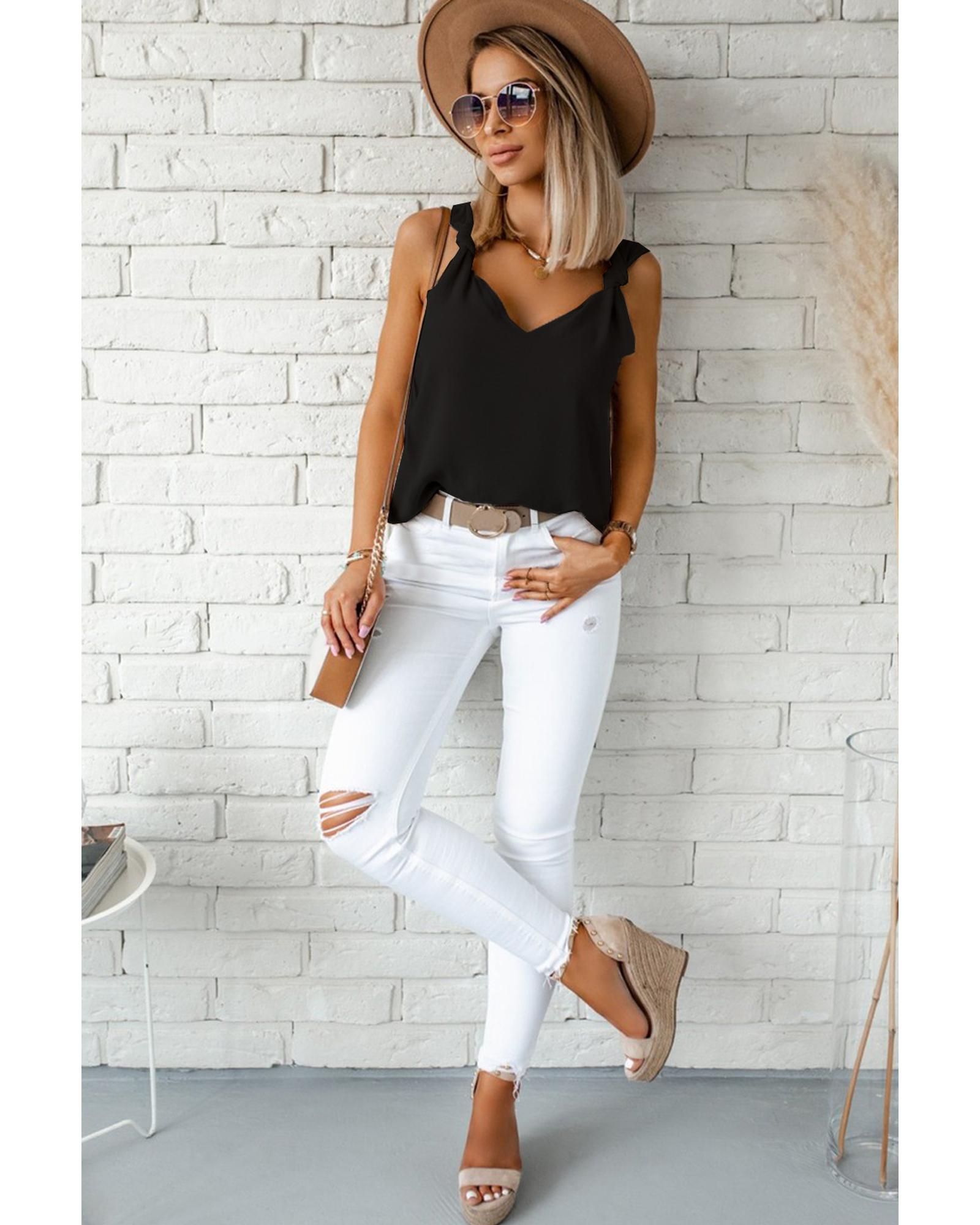 Effortlessly chic and designed for warm-weather days, this V-neck vest features a stylish knotted shoulder detail that elevates a classic sleeveless top. Crafted from fine materials for lasting comfort and a flattering drape, it’s an ideal pick for a sexy, cool summer look.