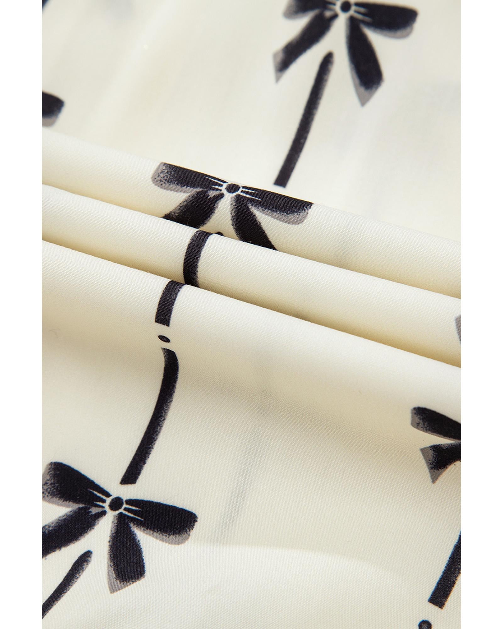 Beige Cute Bowknot Printed Bubble Sleeve V Neck Mini Dress - L