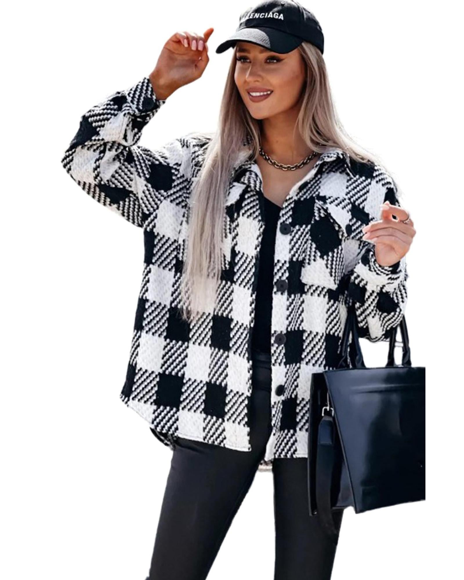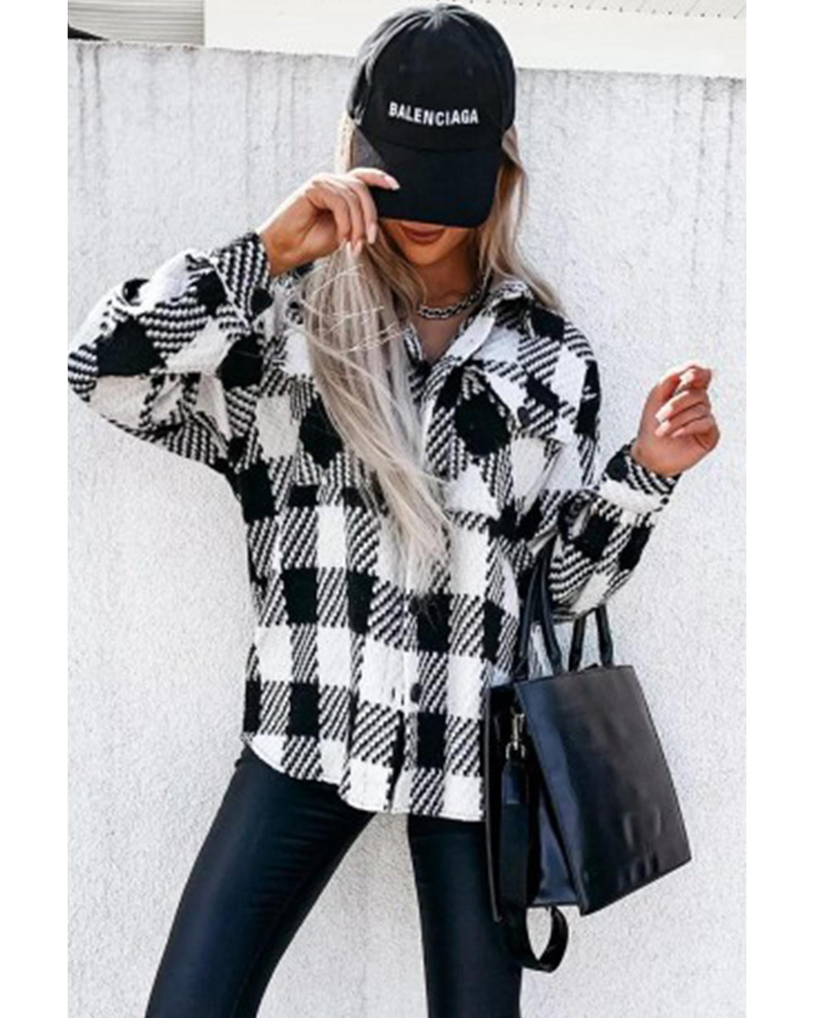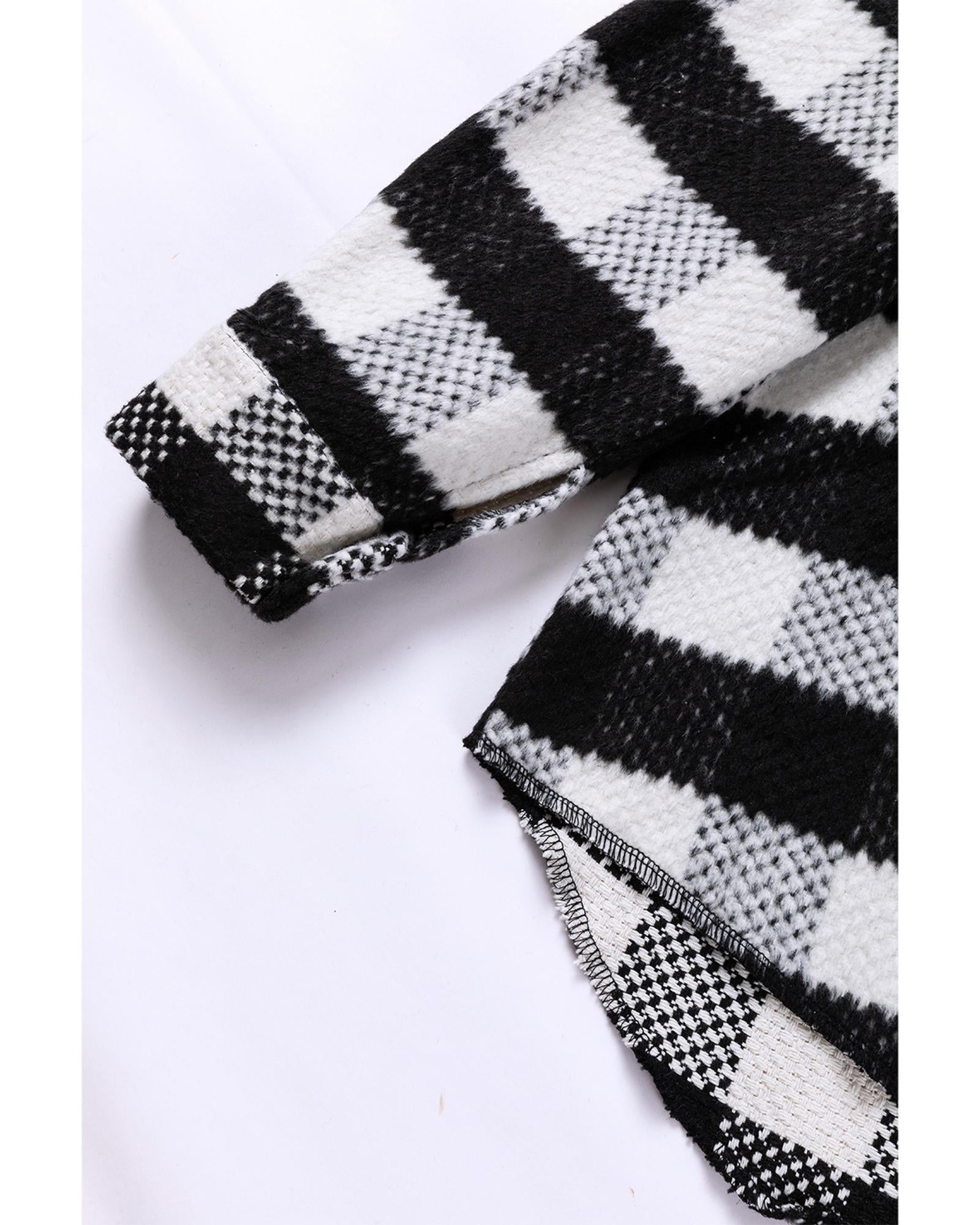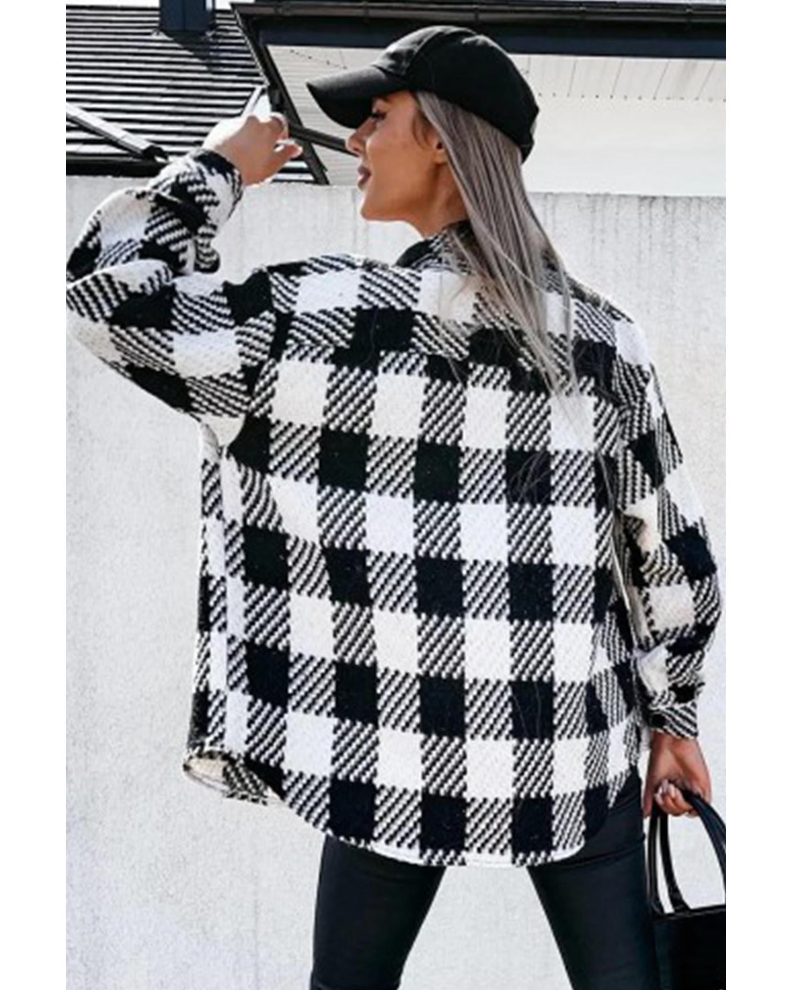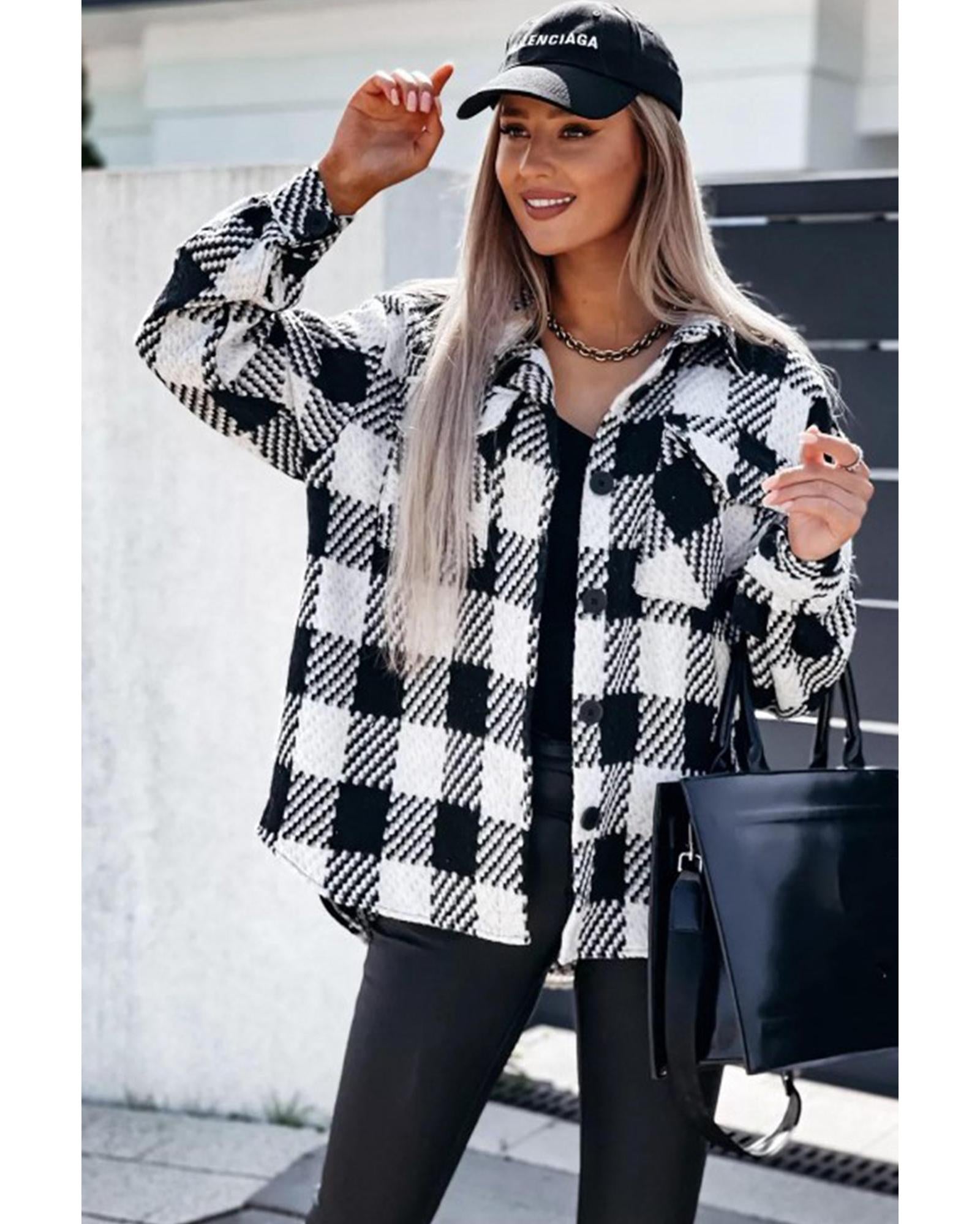 This black plaid shacket features a textured finish and flap pocket, offering a stylish and versatile layer for both casual and polished looks. Made with durable, high-quality materials for lasting wear.