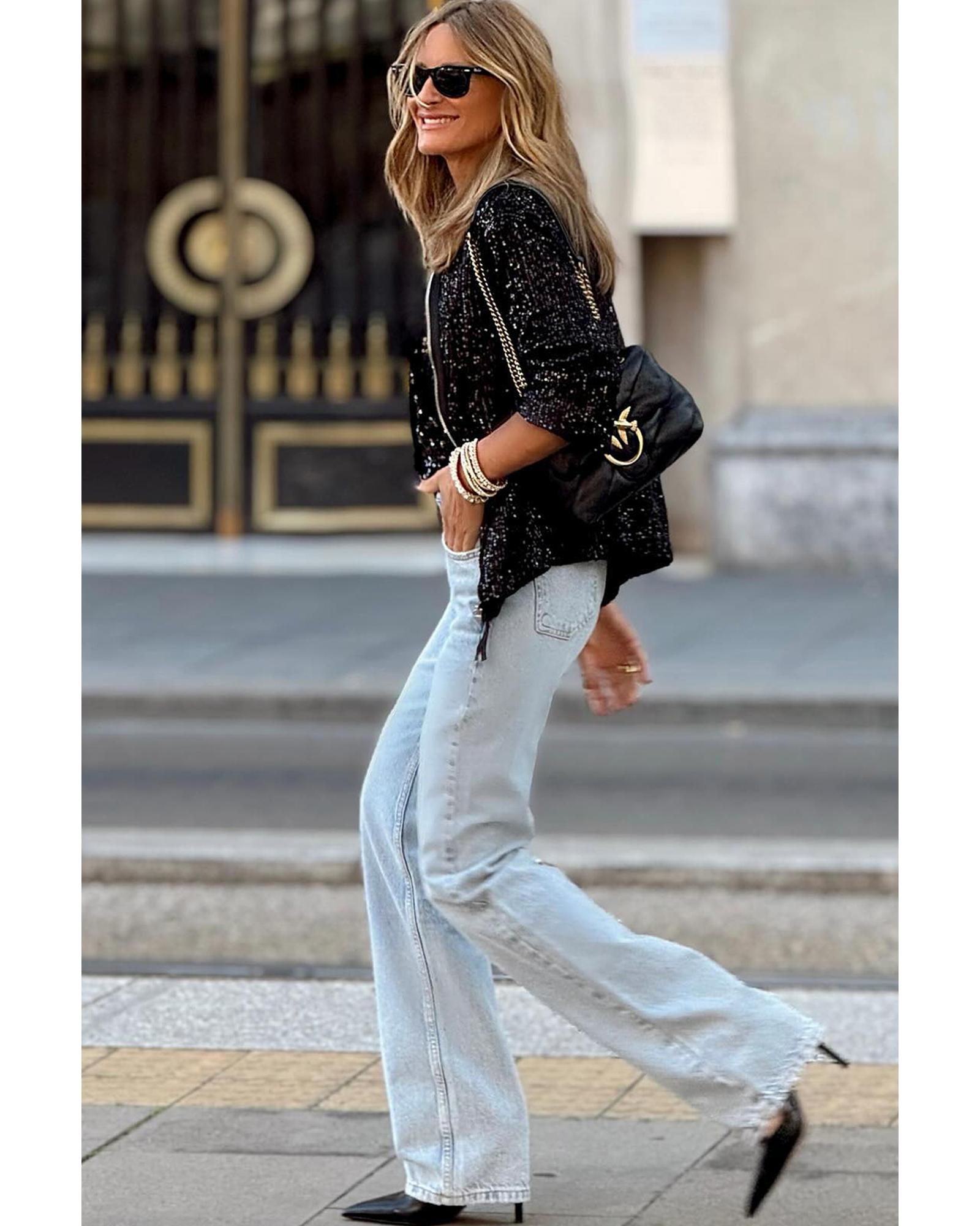 Black Sequin Zip up Round Neck Long Sleeve Jacket - L