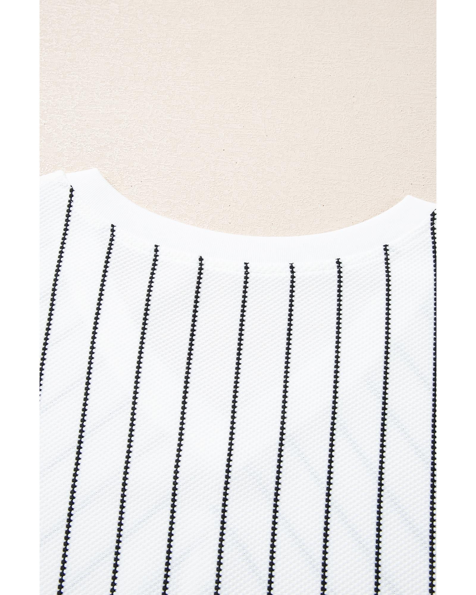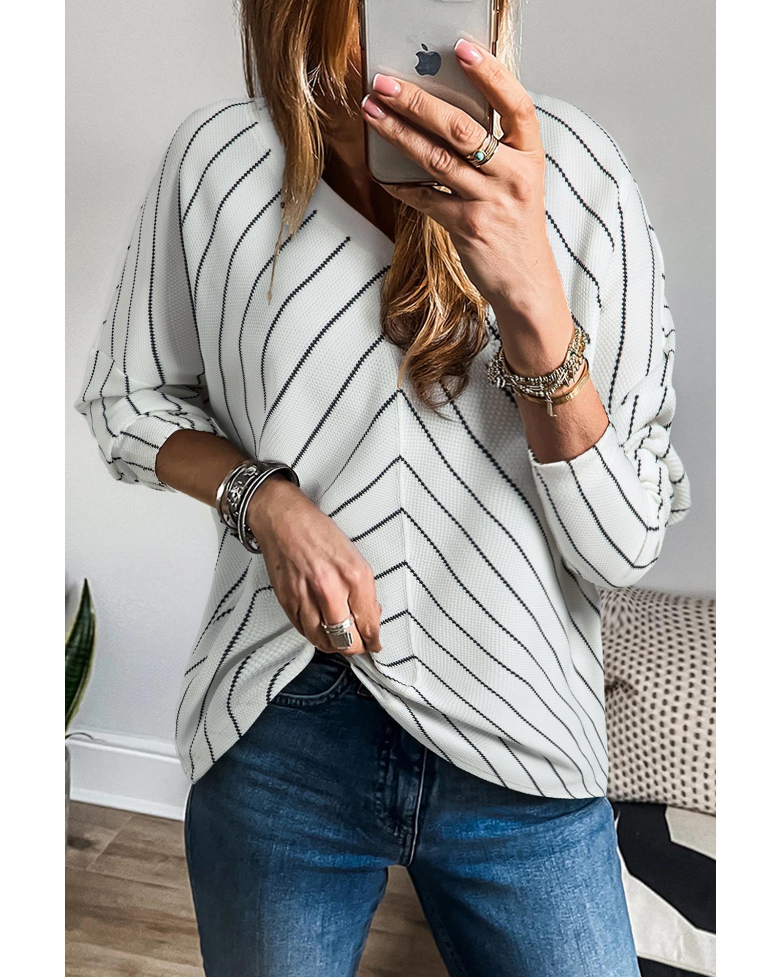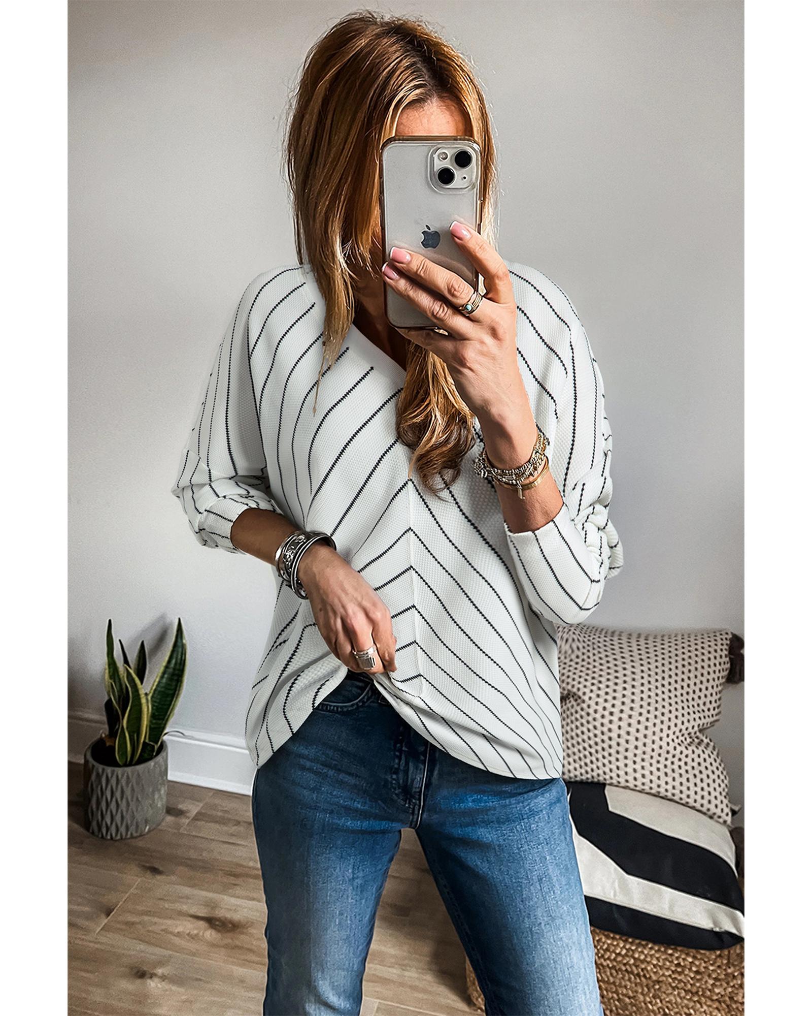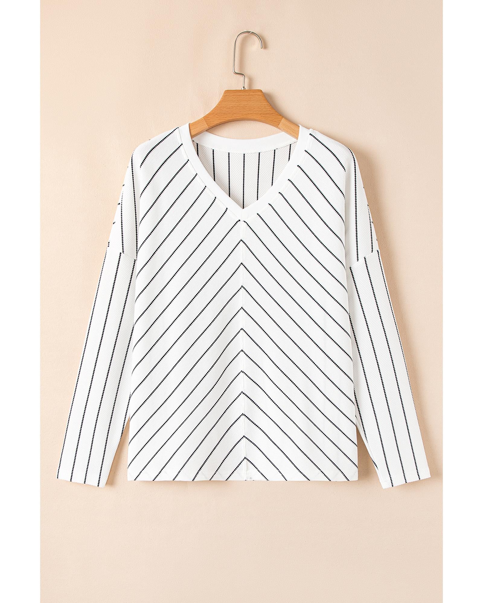 This fitted black stripe long sleeve top features a classic chevron pattern and a flattering V-neckline. Made from a soft, breathable 70% polyester and 30% cotton blend, it ensures all-day comfort. Perfect for casual or smart-casual occasions, it pairs well with a variety of bottoms for an effortlessly elegant look. For the best fit, consider choosing one size up and refer to our sizing chart.