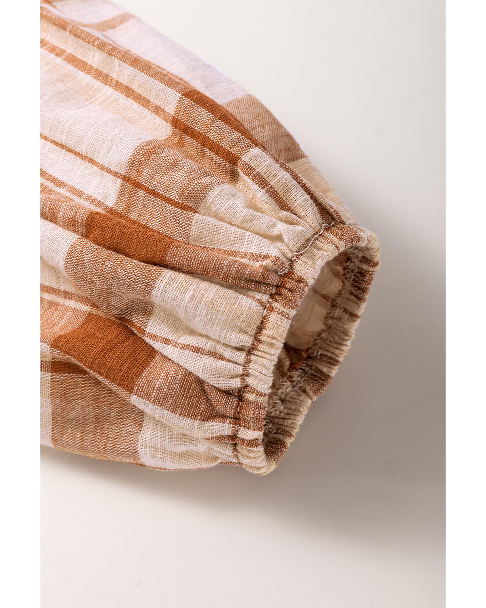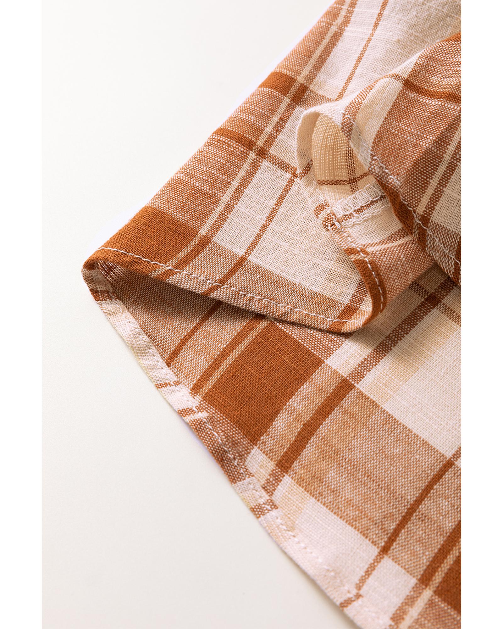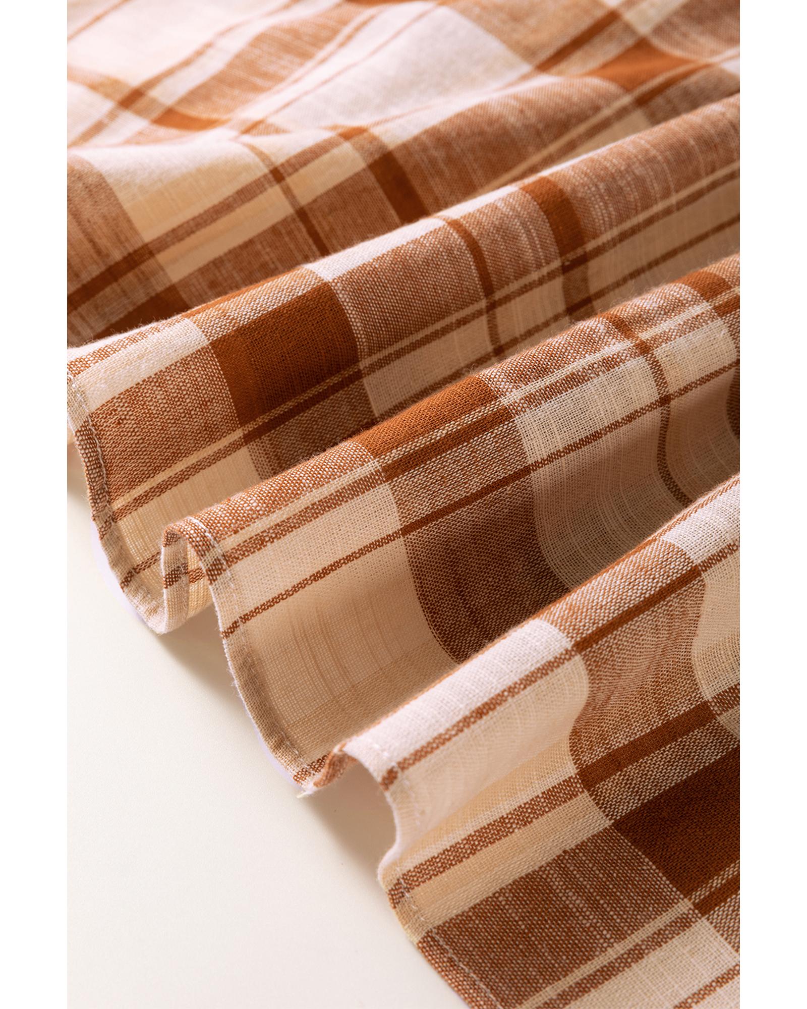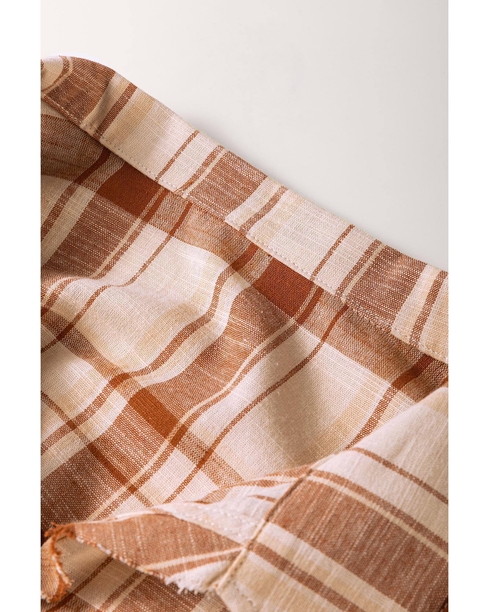 Elevate your wardrobe with this Brown Plaid Print Side Pockets Frilled Babydoll Mini Dress, designed to blend classic charm with modern practicality. Featuring a timeless plaid print, this dress includes side pockets that add both style and convenient storage. The delicate frilled details introduce a soft, feminine touch, perfectly complementing the babydoll silhouette that offers a flattering, youthful shape. Versatile enough for special occasions yet comfortable for everyday wear, this mini dress transitions effortlessly from day to night, making it an essential piece for your collection.