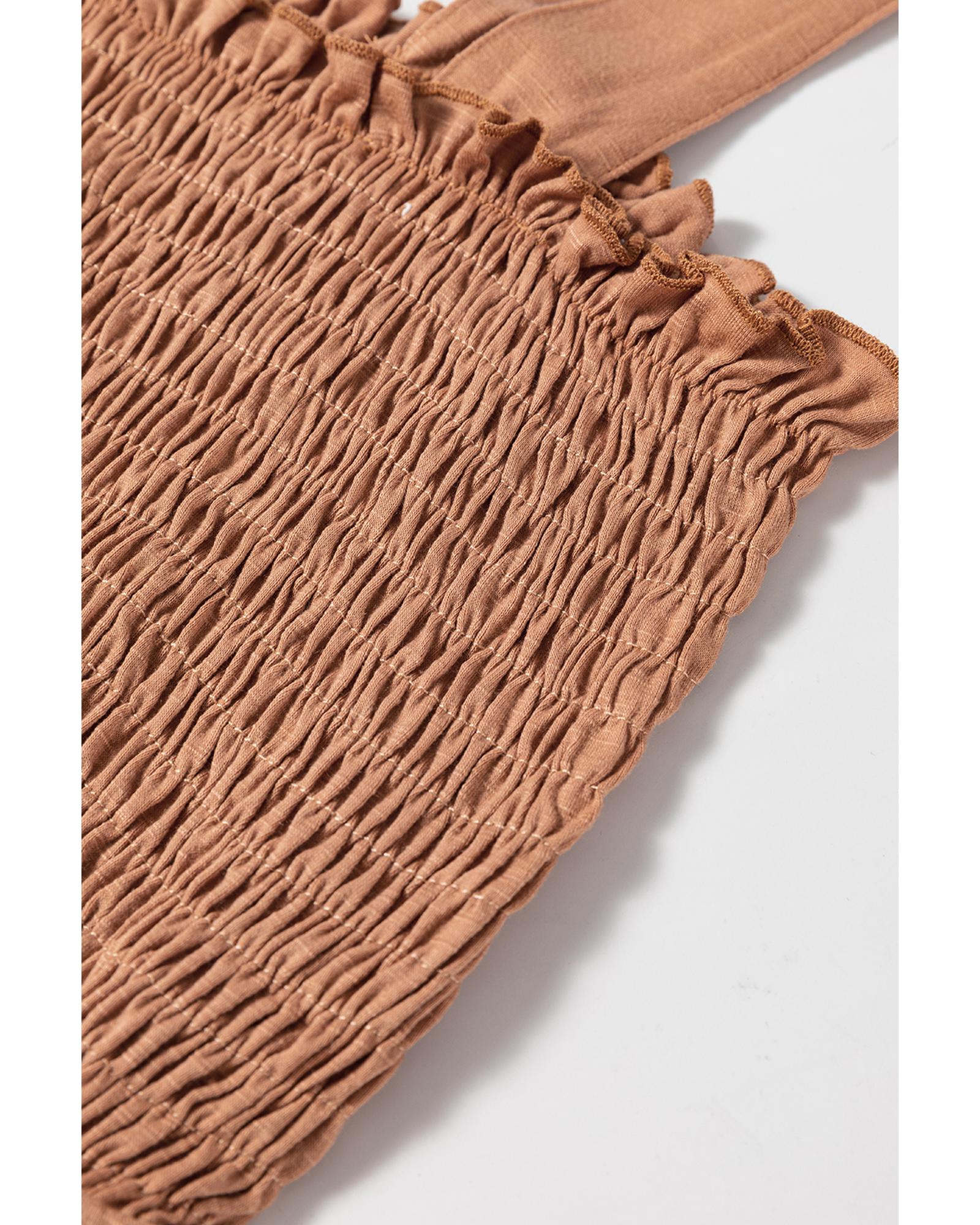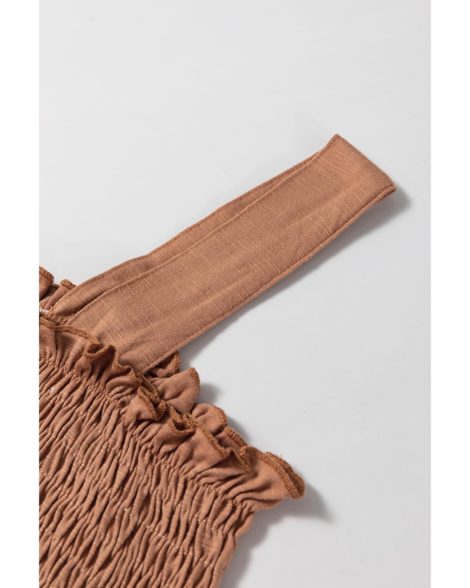 Features a shirred bodice paired with wide leg pants that create a flattering fit and flare silhouette. Thin straps offer a sexy, flirty appeal while the ruffled neckline adds a sweet, feminine touch. Flattering for curvy silhouettes, this jumpsuit pairs beautifully with a necklace and slippers for a chic bohemian look. An ideal versatile wardrobe essential perfect for boutiques and fashion-forward wardrobes alike.