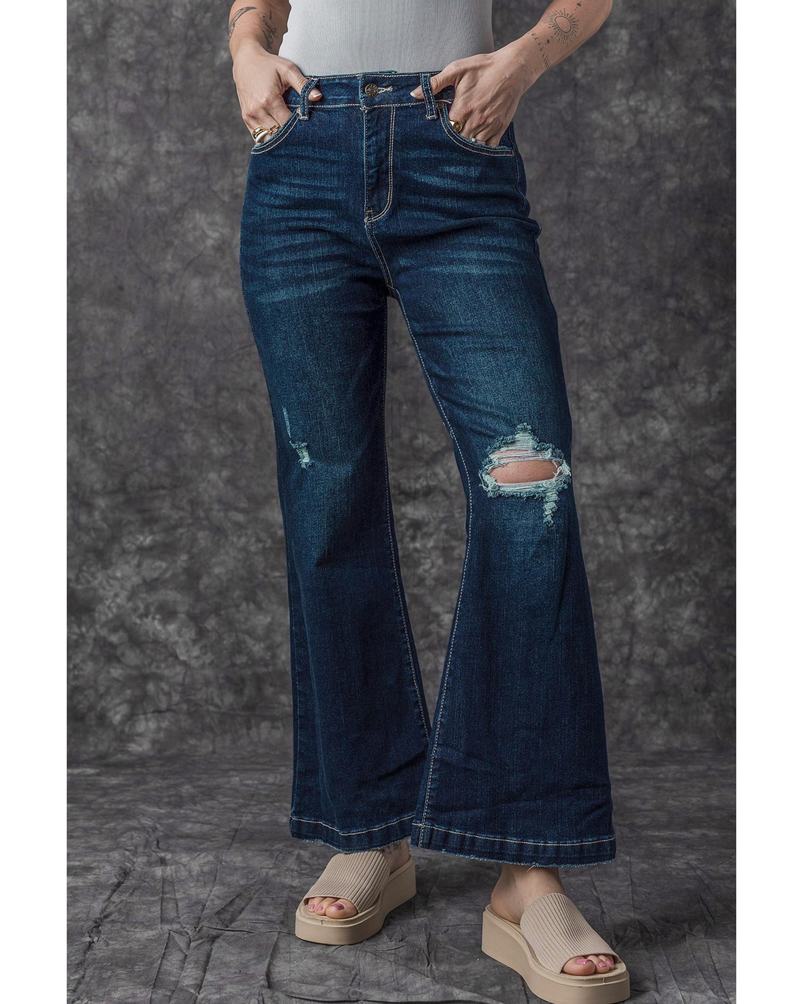 These high-rise bell-bottom jeans combine a flattering fit with stylish ripped details. Made from soft, stretchy denim, they offer comfort and a vintage-inspired look. Perfect for dressing up or down, they easily complement both casual and chic outfits.