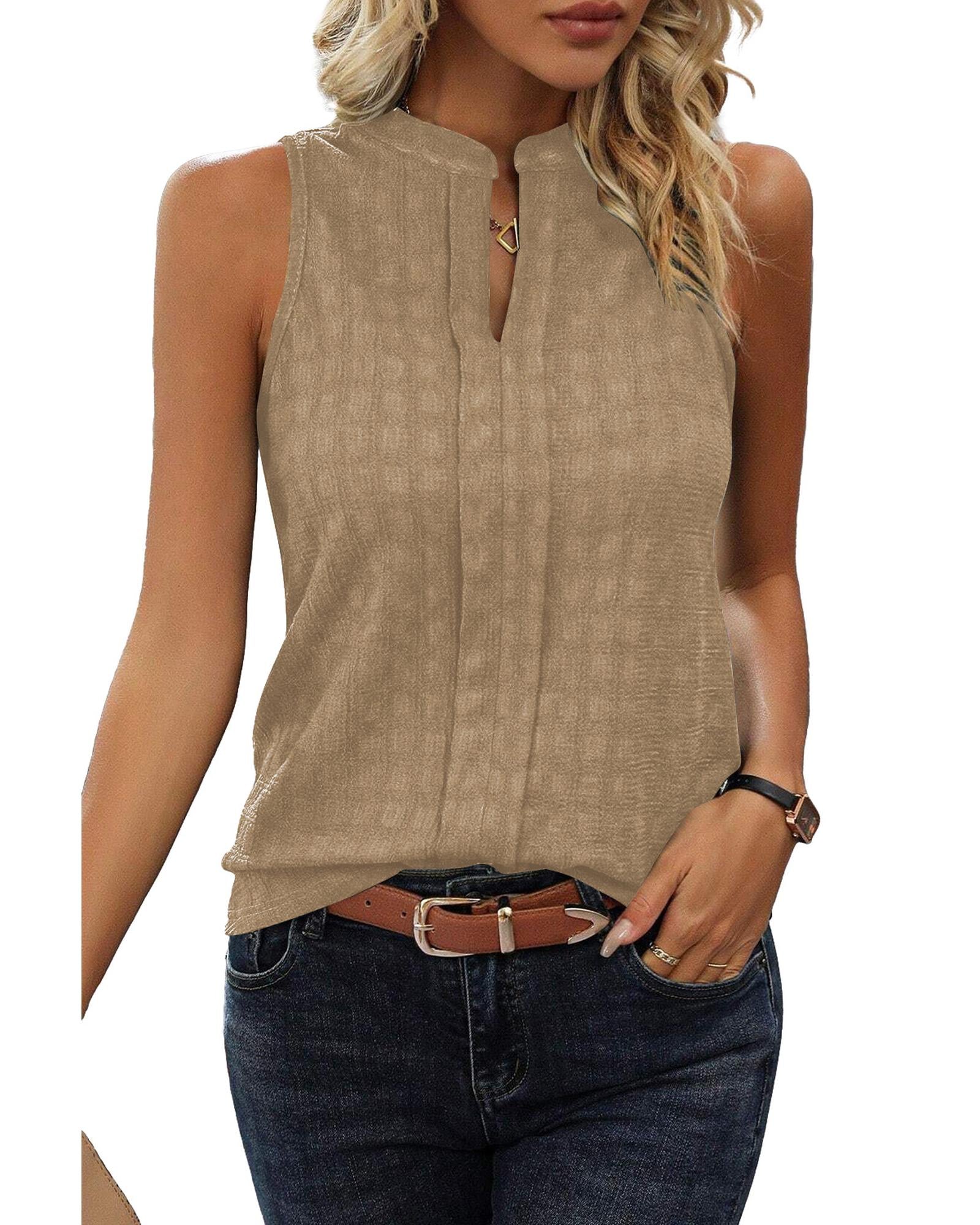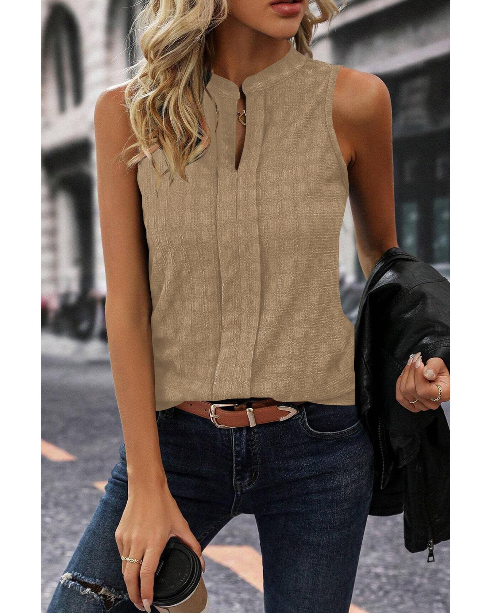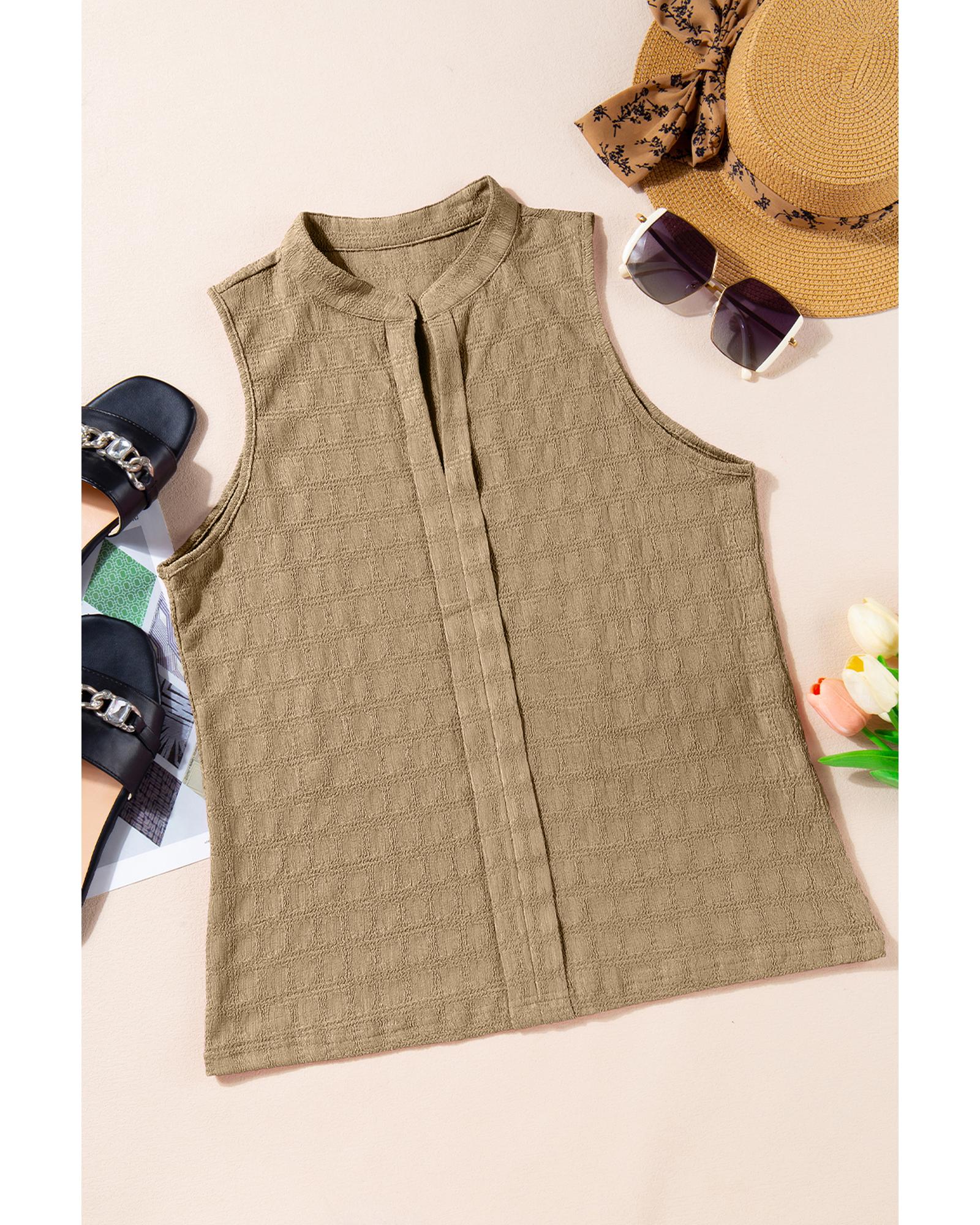 This tank top features a subtle lattice texture and a split neck for a stylish, versatile look. Its sleeveless design pairs well with pants, skirts, or shorts, suitable for both casual and dressier occasions. Made with medium stretch fabric, it offers a comfortable fit that retains shape. Perfect as a standalone top or layered under blazers and cardigans, it flatters various body shapes and ages with a polished silhouette.