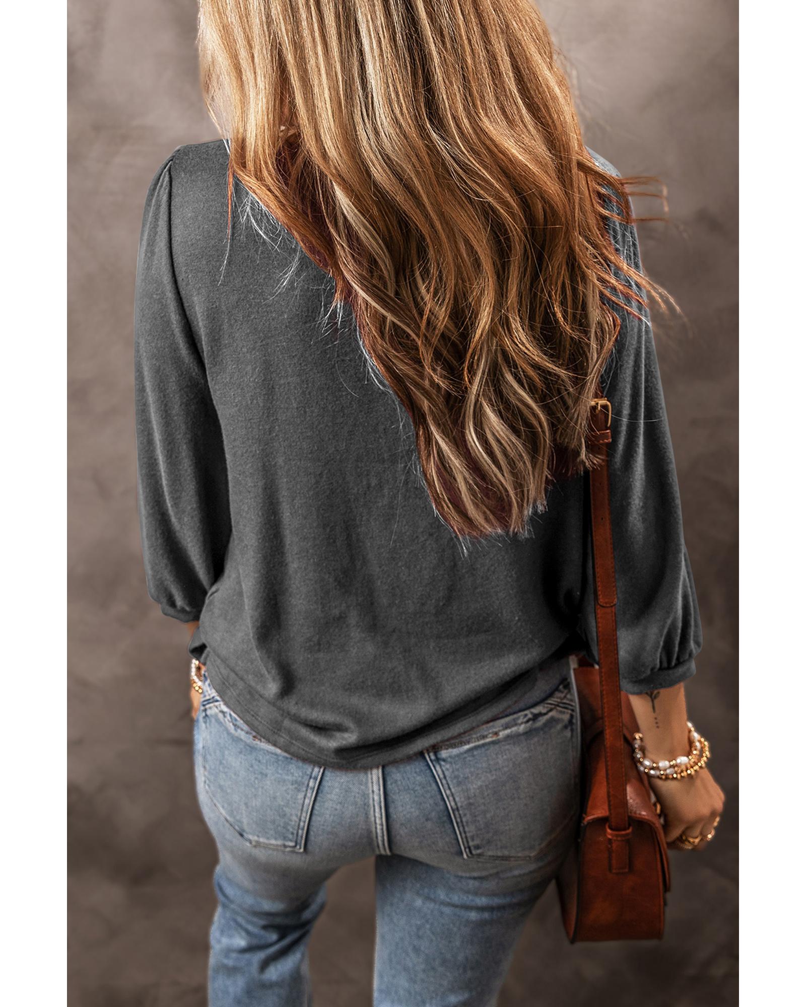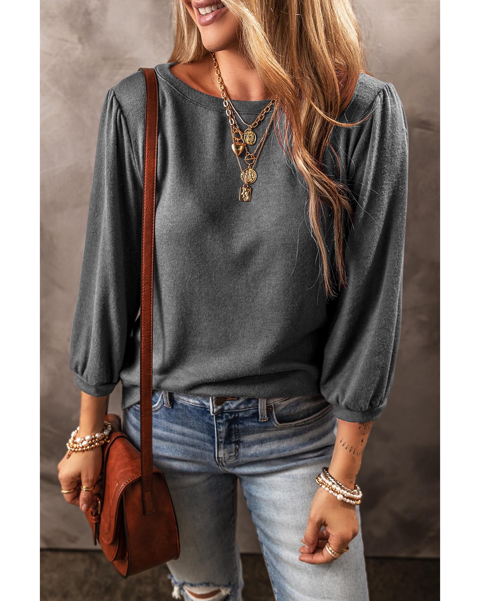 This medium grey blouse features 3/4 sleeves and a round neckline, designed with a fitted style and made from a comfortable 95% polyester and 5% elastane blend. Suitable for various occasions, it offers both stretch and durability. For the best fit, consider sizing up and consult our sizing chart.