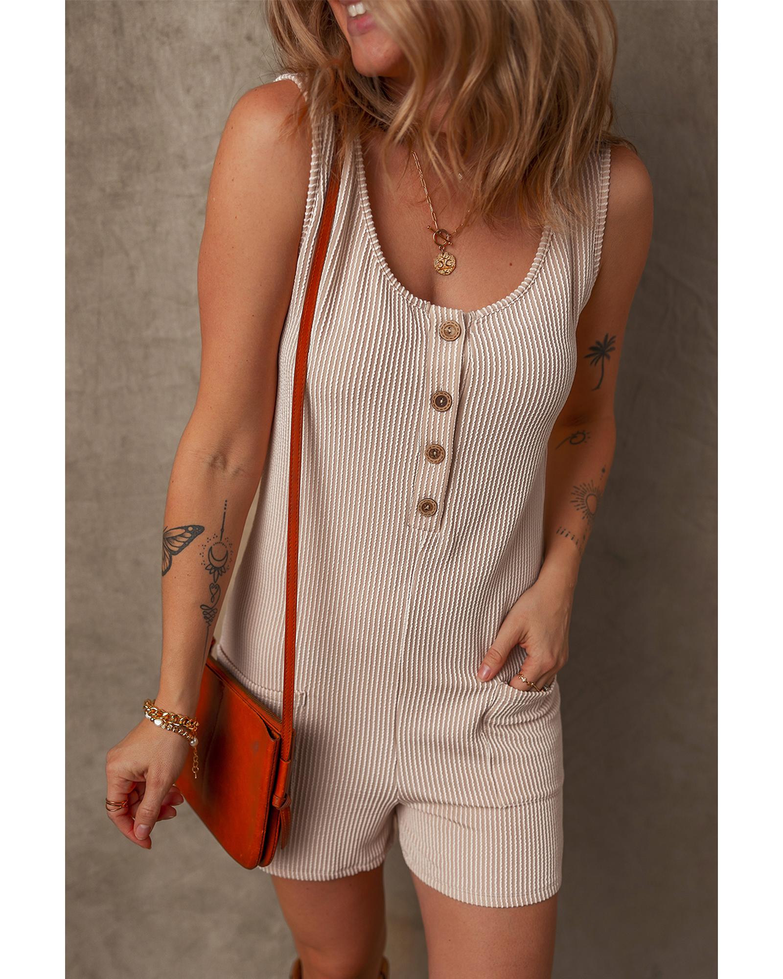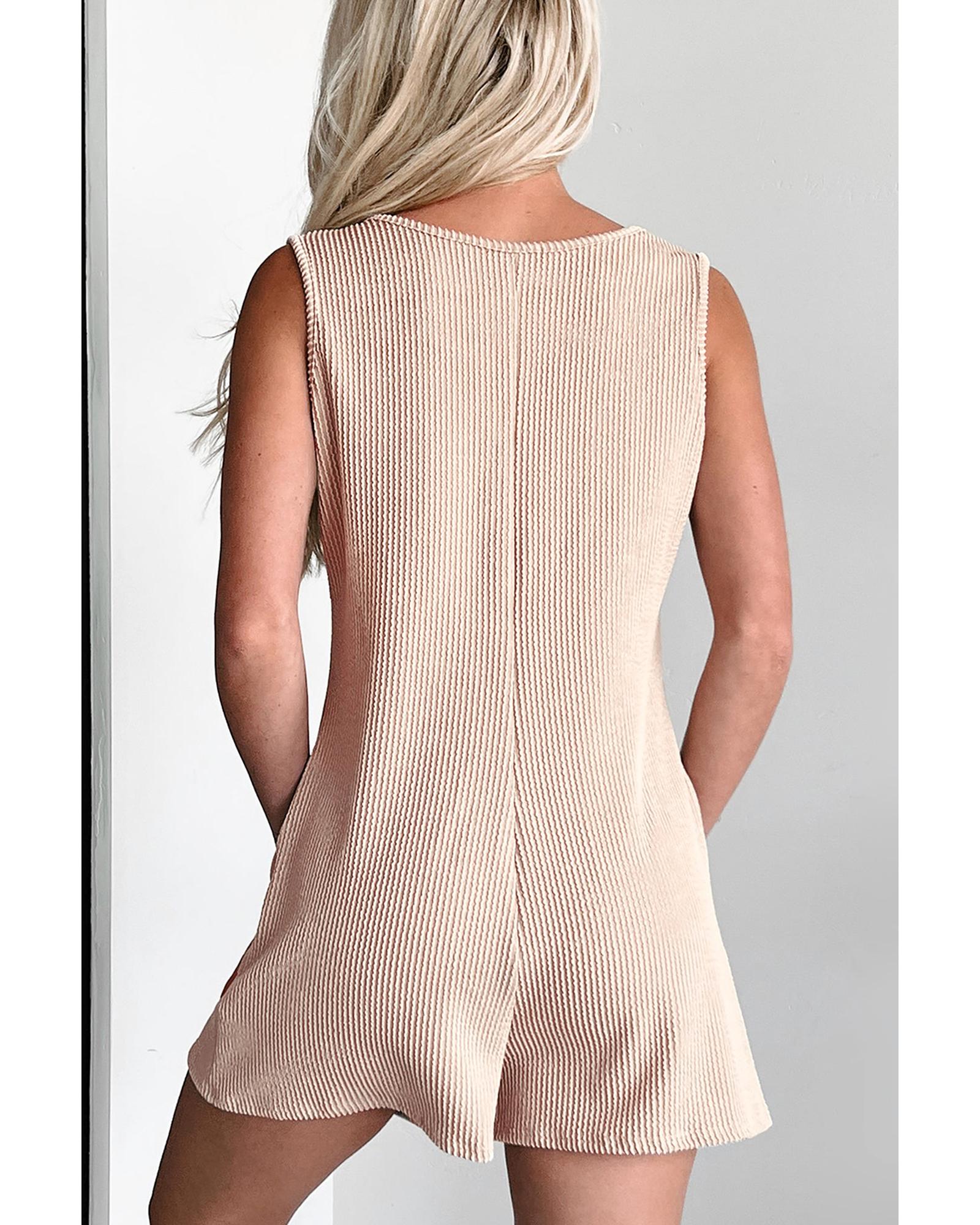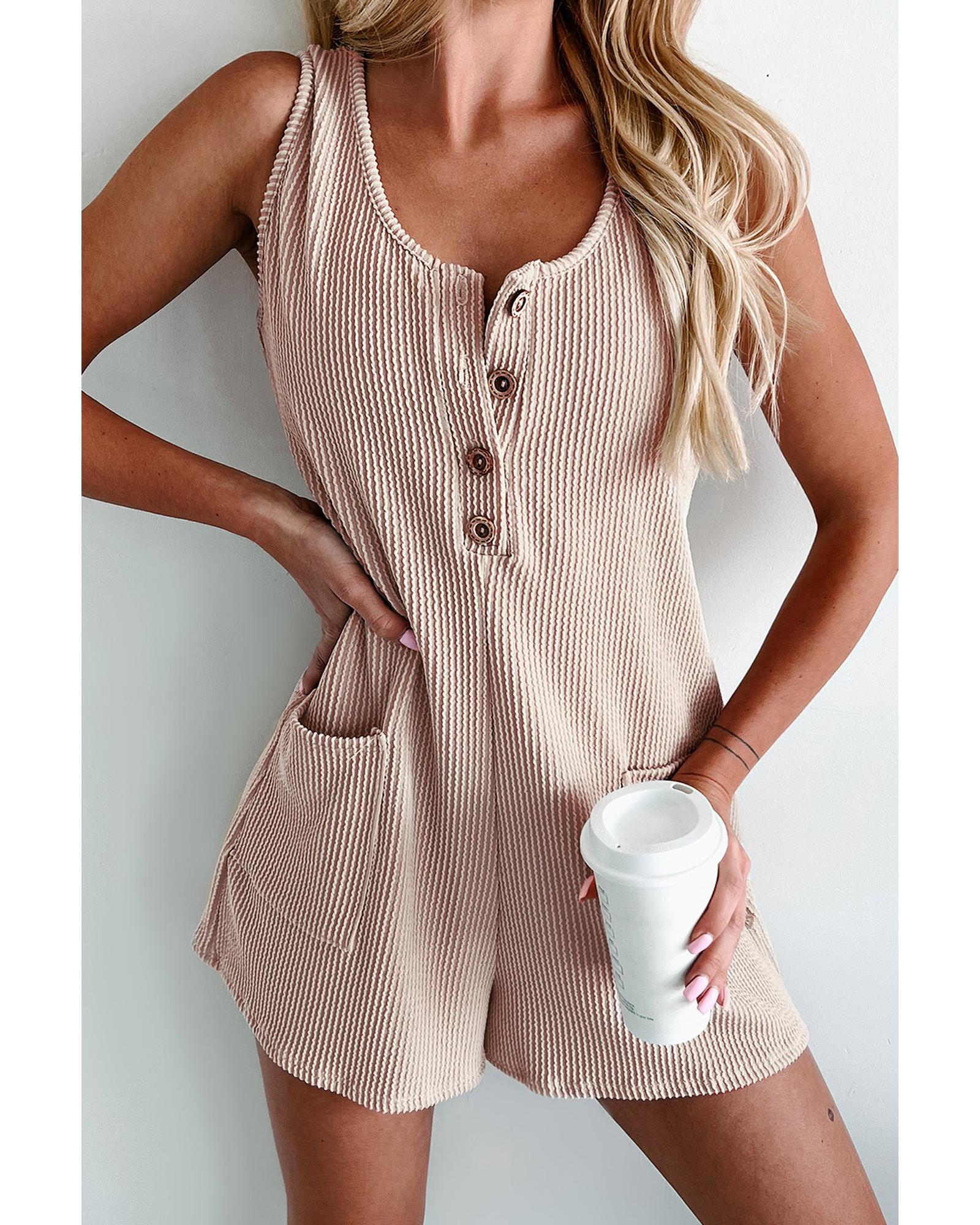 Casual and fashionable romper crafted from soft corded knit fabric for a comfortable fit. Features a stylish half placket that adds a chic, modern touch. Breathable, sleeveless design keeps you cool and comfortable in warmer weather. Equipped with functional side pockets for convenience and practicality.
