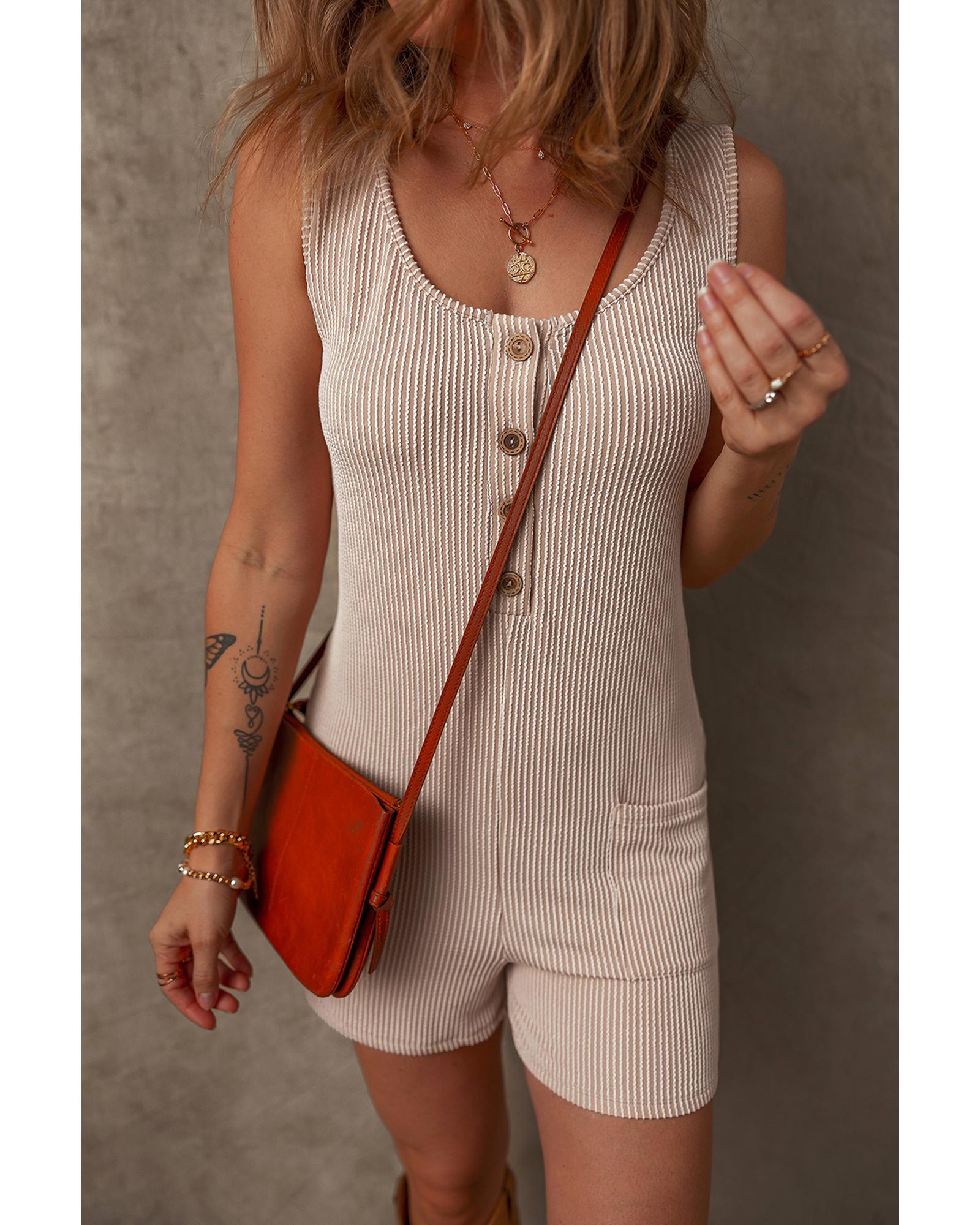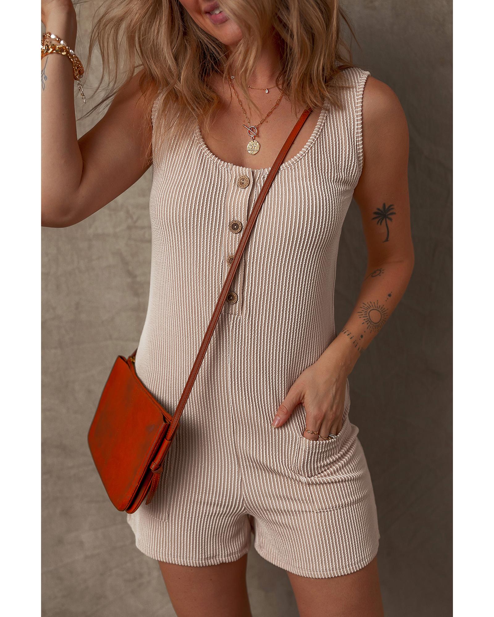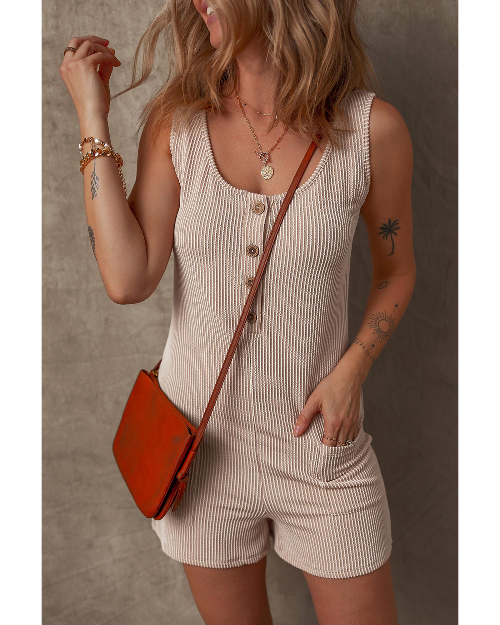 Casual and fashionable romper crafted from soft corded knit fabric for a comfortable fit. Features a stylish half placket that adds a chic, modern touch. Breathable, sleeveless design keeps you cool and comfortable in warmer weather. Equipped with functional side pockets for convenience and practicality.