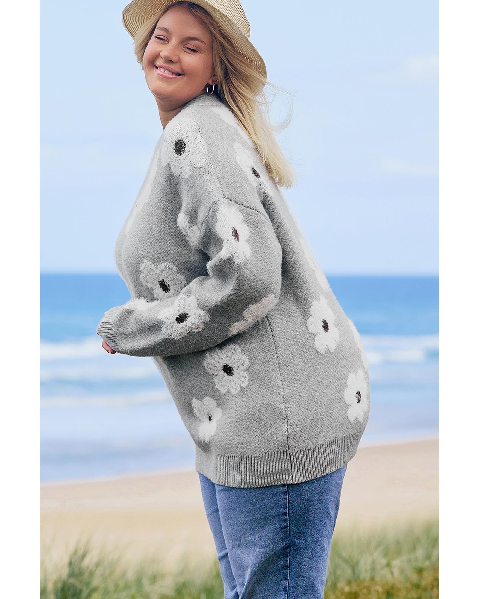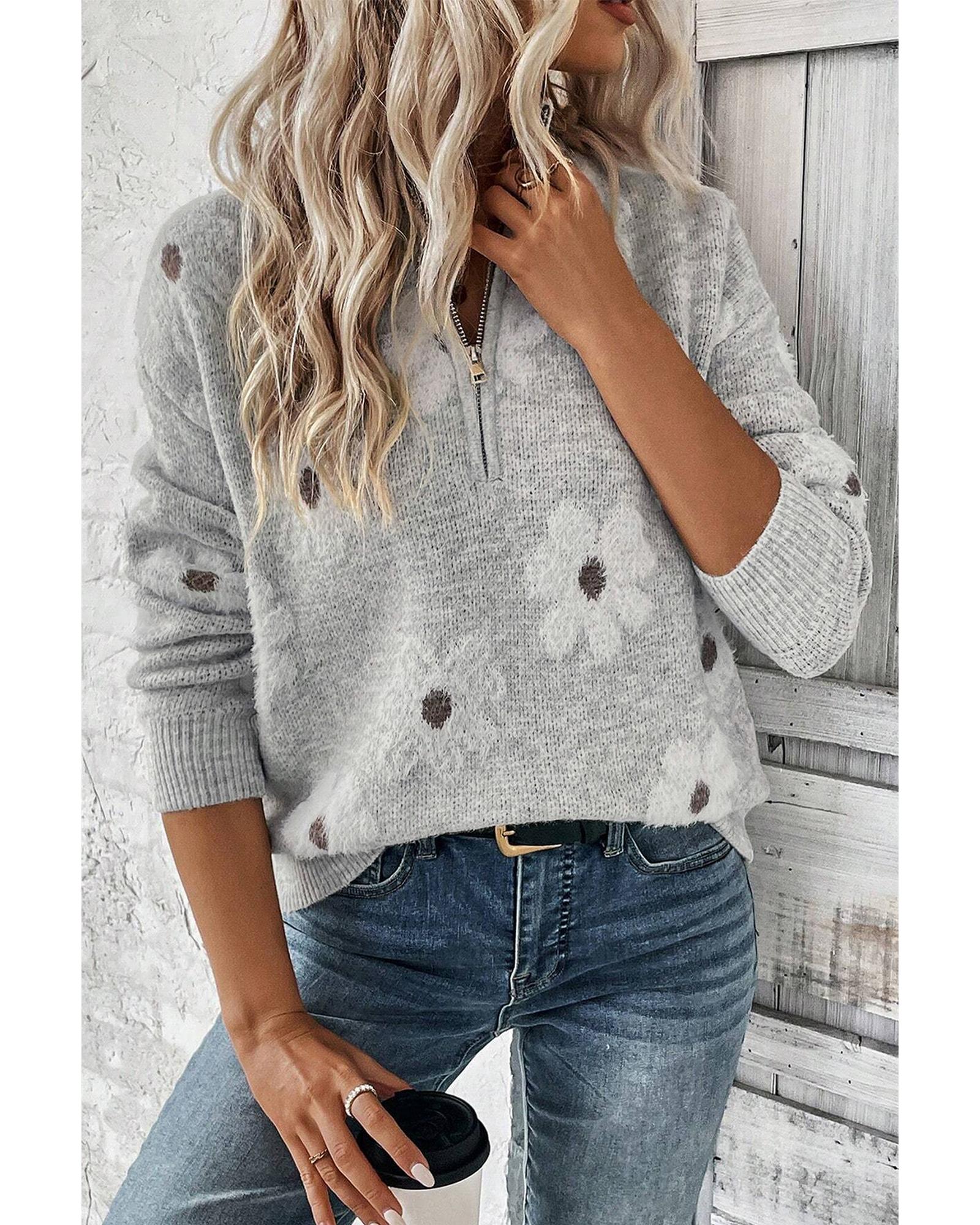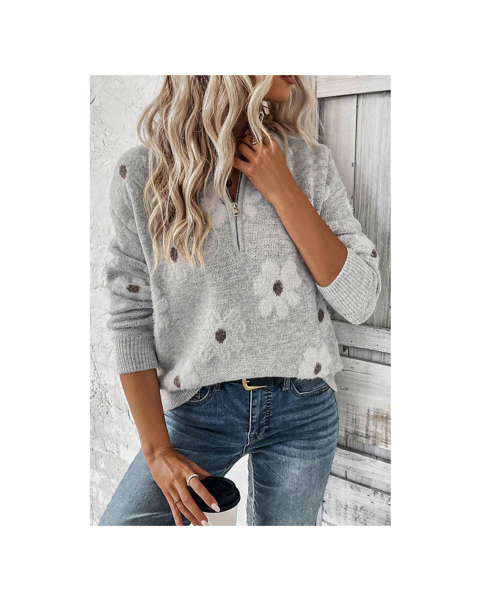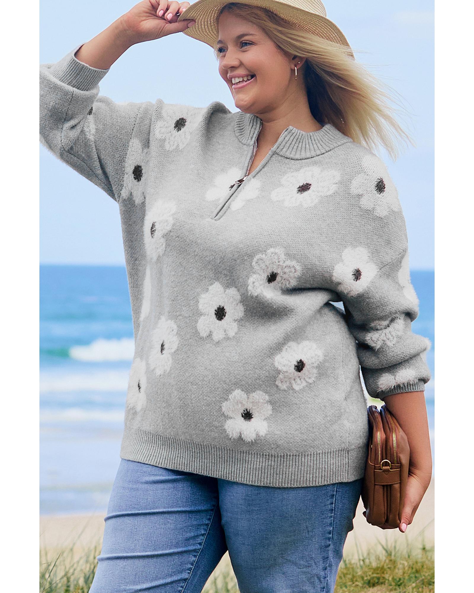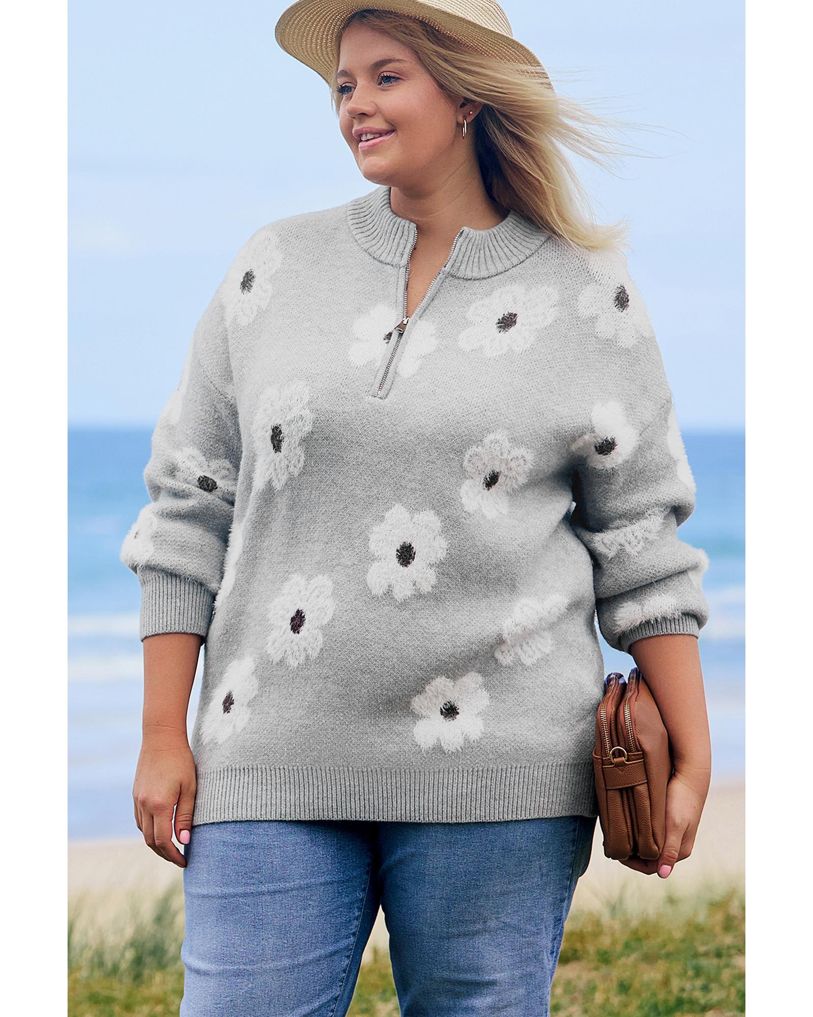 This plus size sweater offers a comfortable fit with a flattering shape. Featuring a half-zip for easy layering and a delicate embroidered floral design, it brings a touch of elegance. The relaxed drop shoulder adds effortless style.