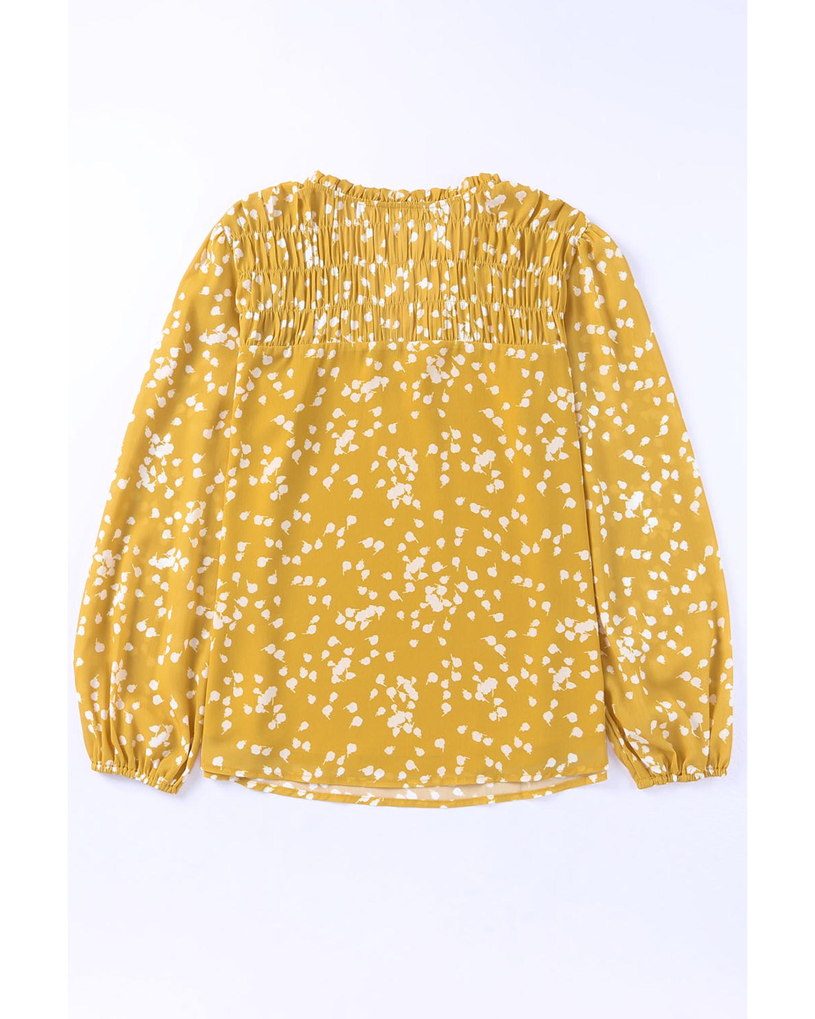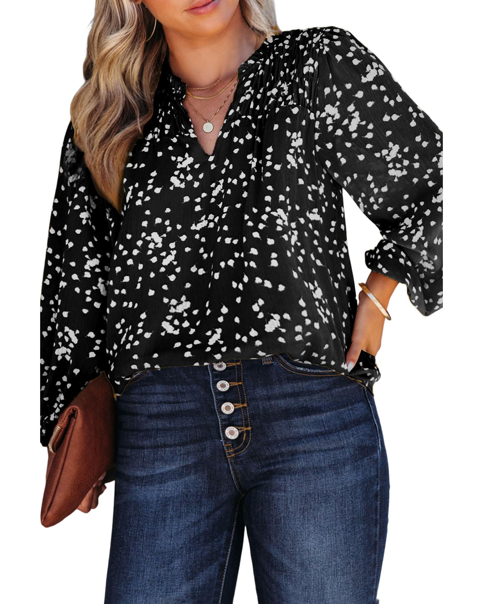 This plus-size blouse features an elegant floral print with ruched detailing and a split V-neck that flatters the face. Puff sleeves add a modern, feminine touch, making it perfect for both everyday wear and special occasions with comfort and style.