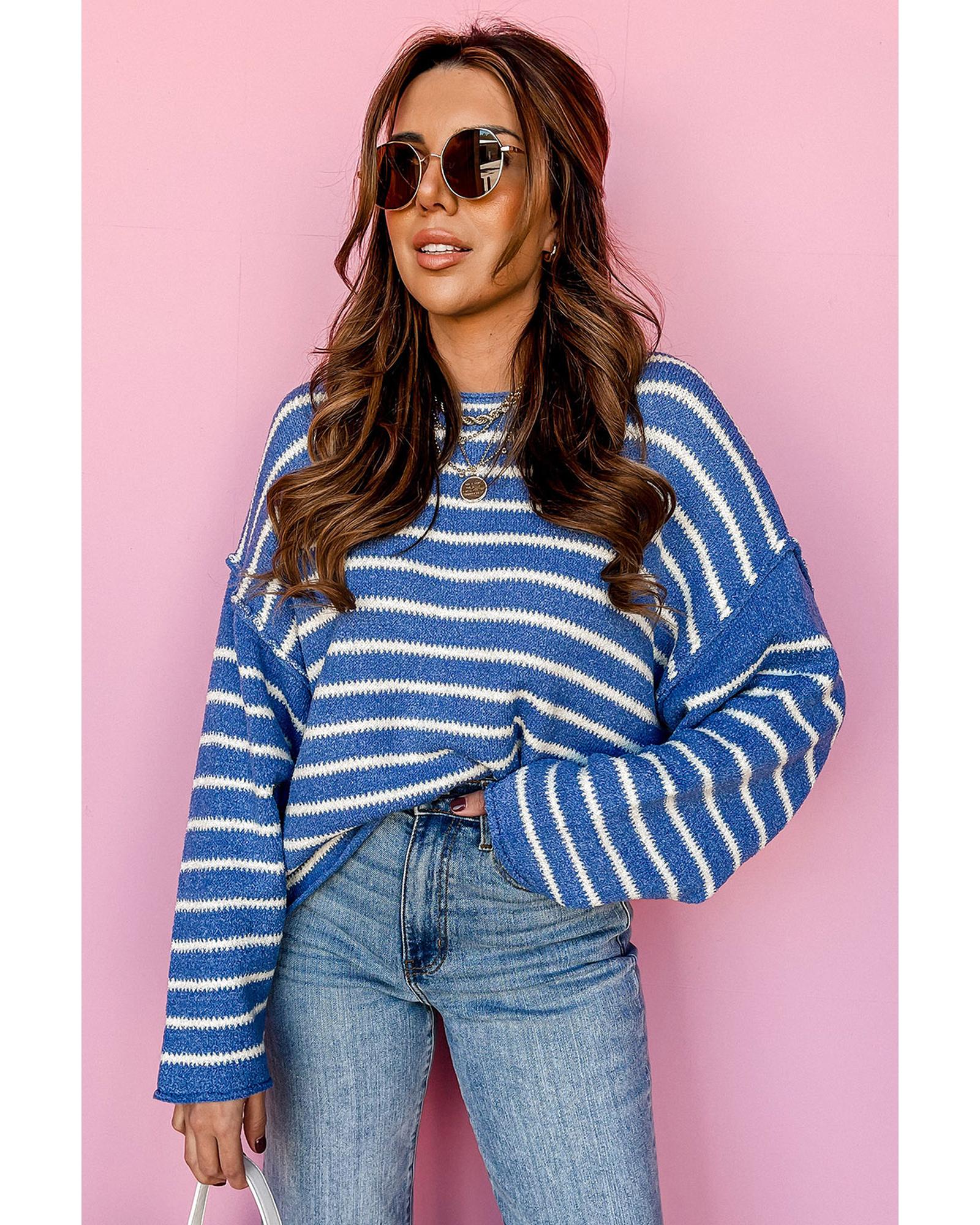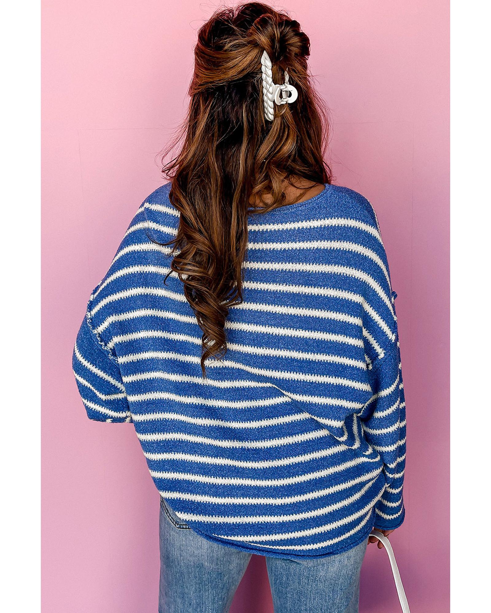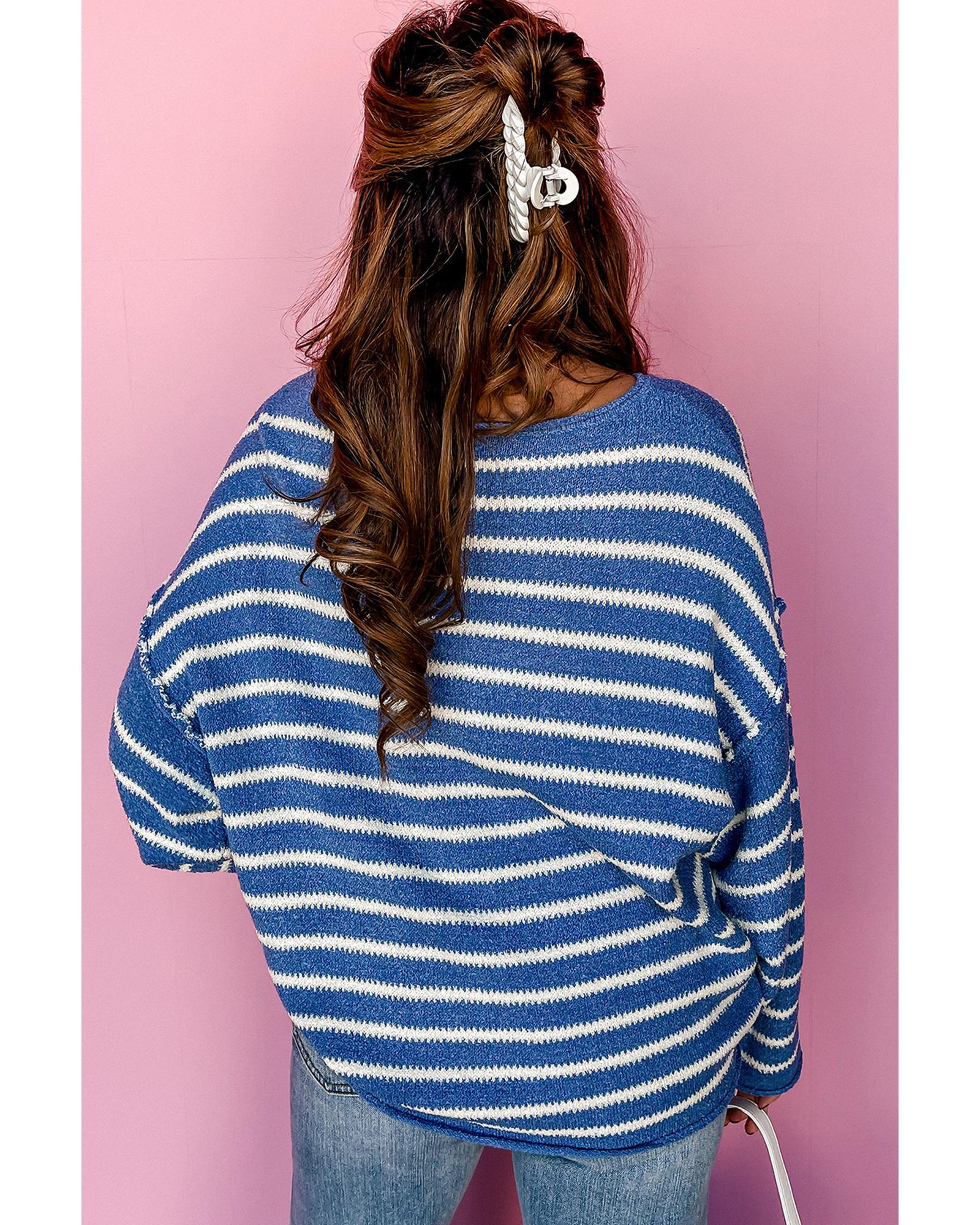 This plus-size sweater in sky blue features a timeless striped pattern and a relaxed drop shoulder fit. Its classic O neck and soft, warm fabric provide both comfort and style for cooler days.