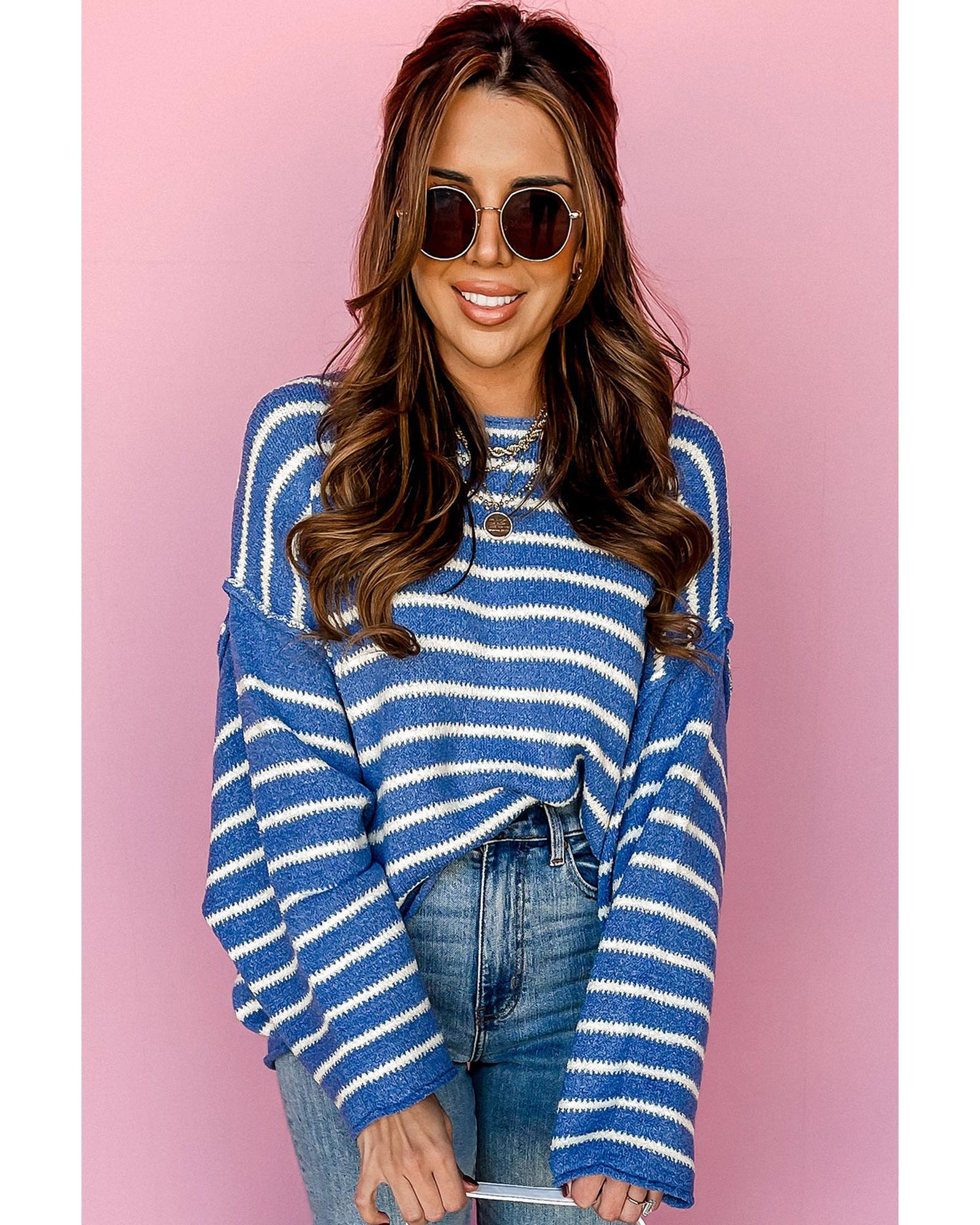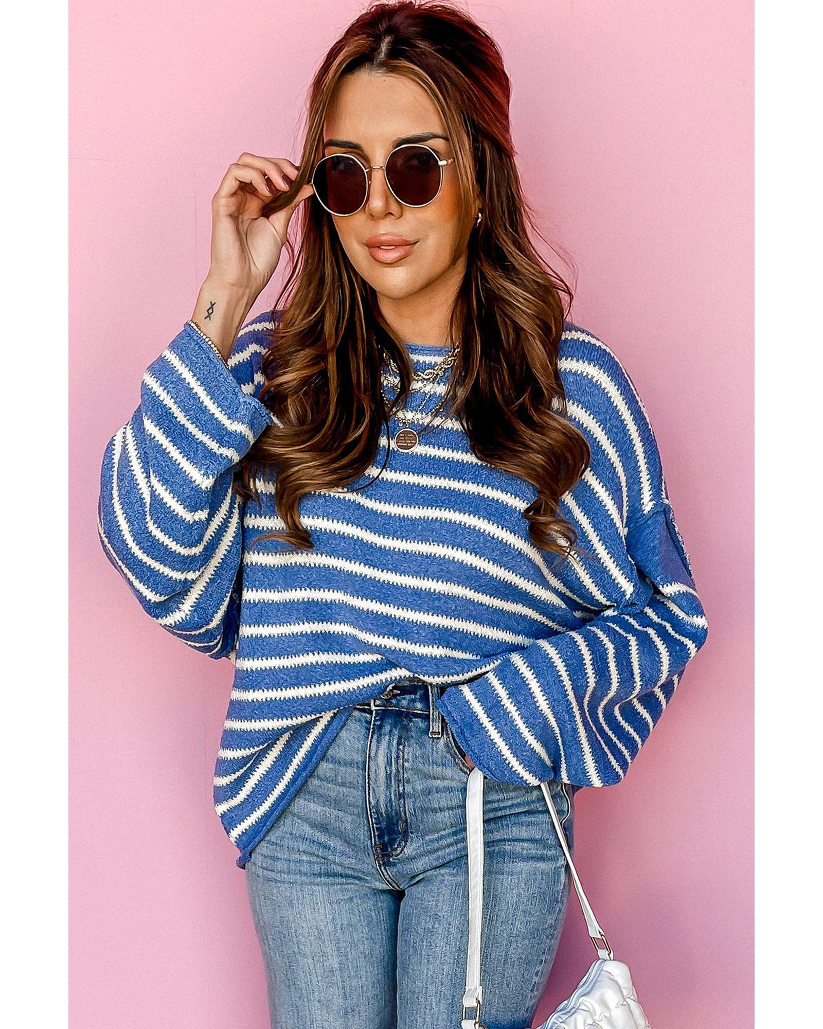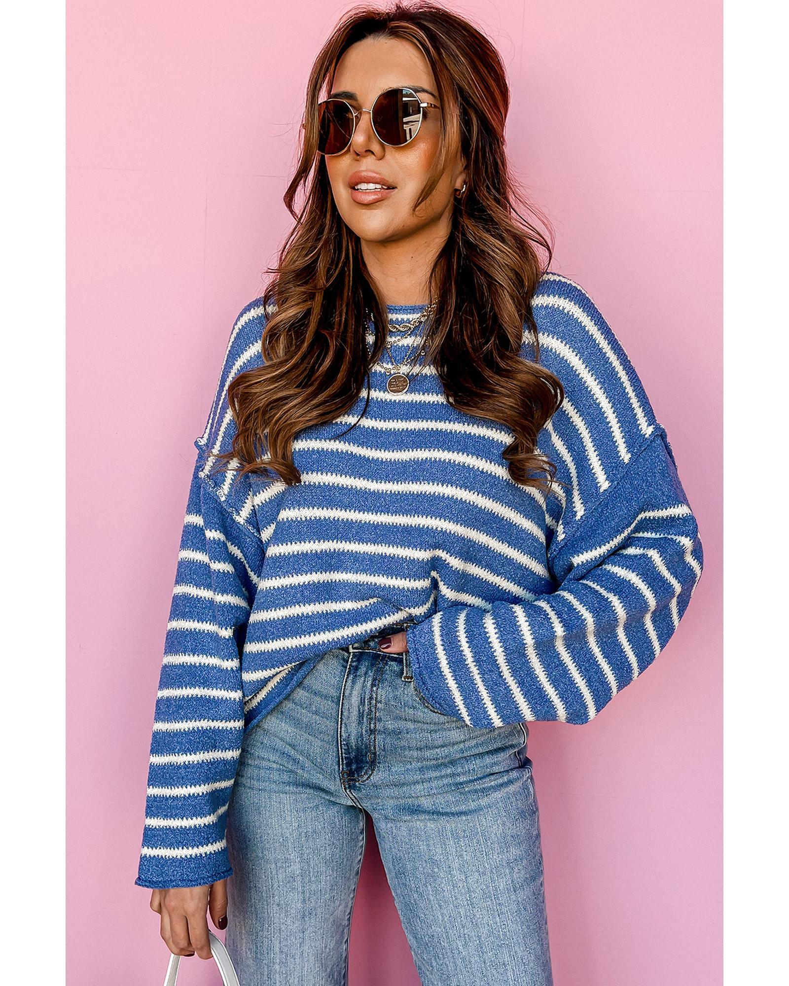 This plus-size sweater in sky blue features a timeless striped pattern and a relaxed drop shoulder fit. Its classic O neck and soft, warm fabric provide both comfort and style for cooler days.