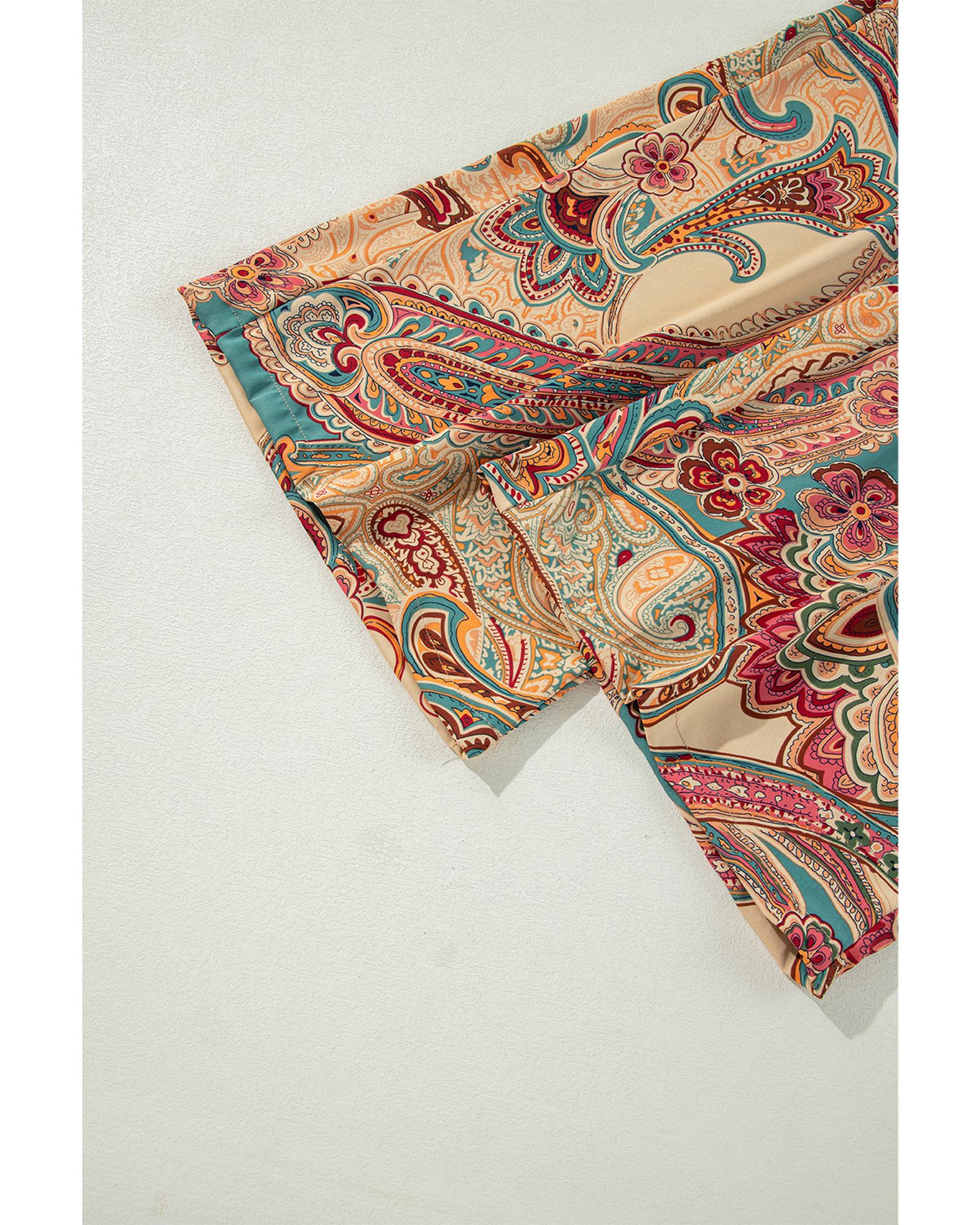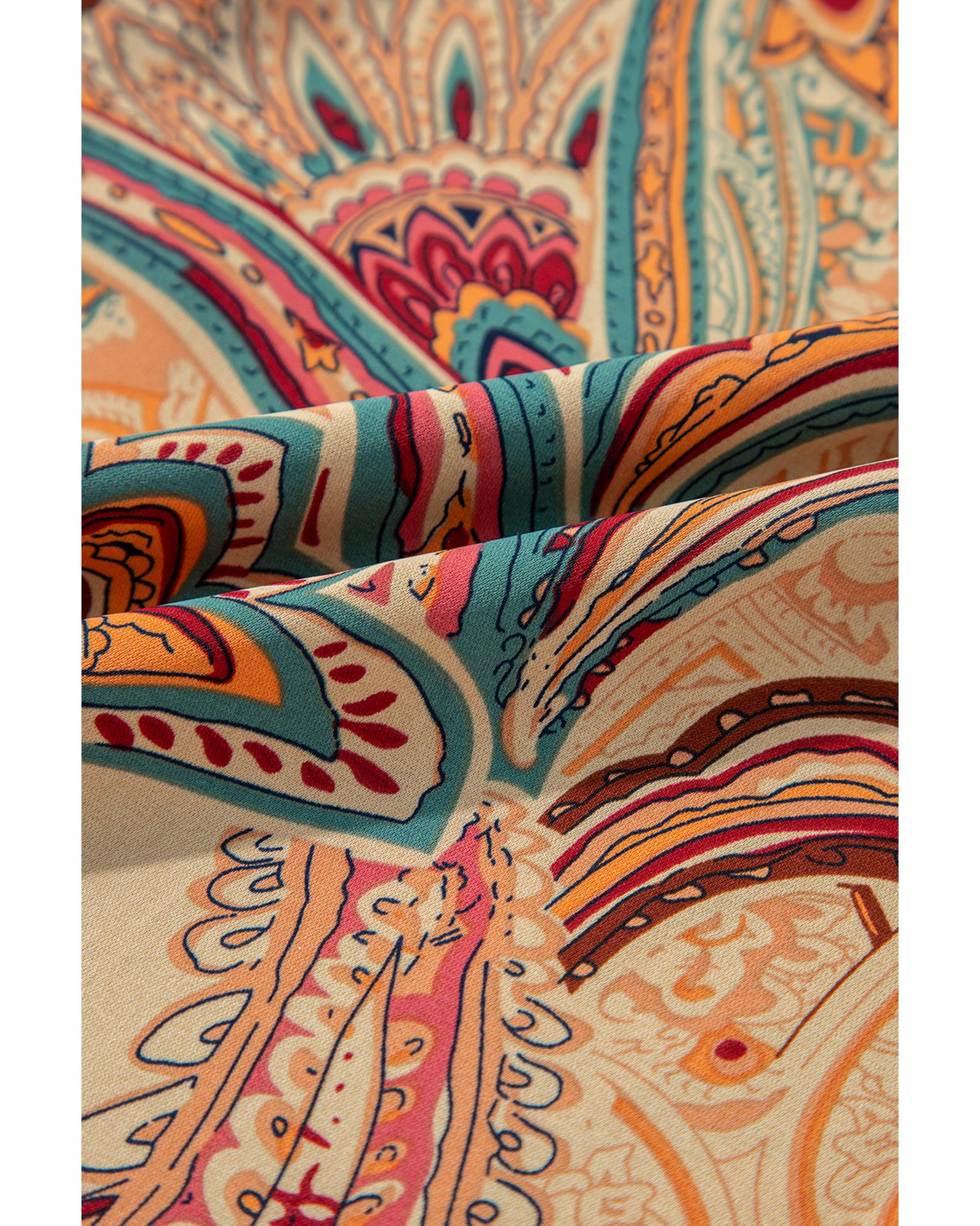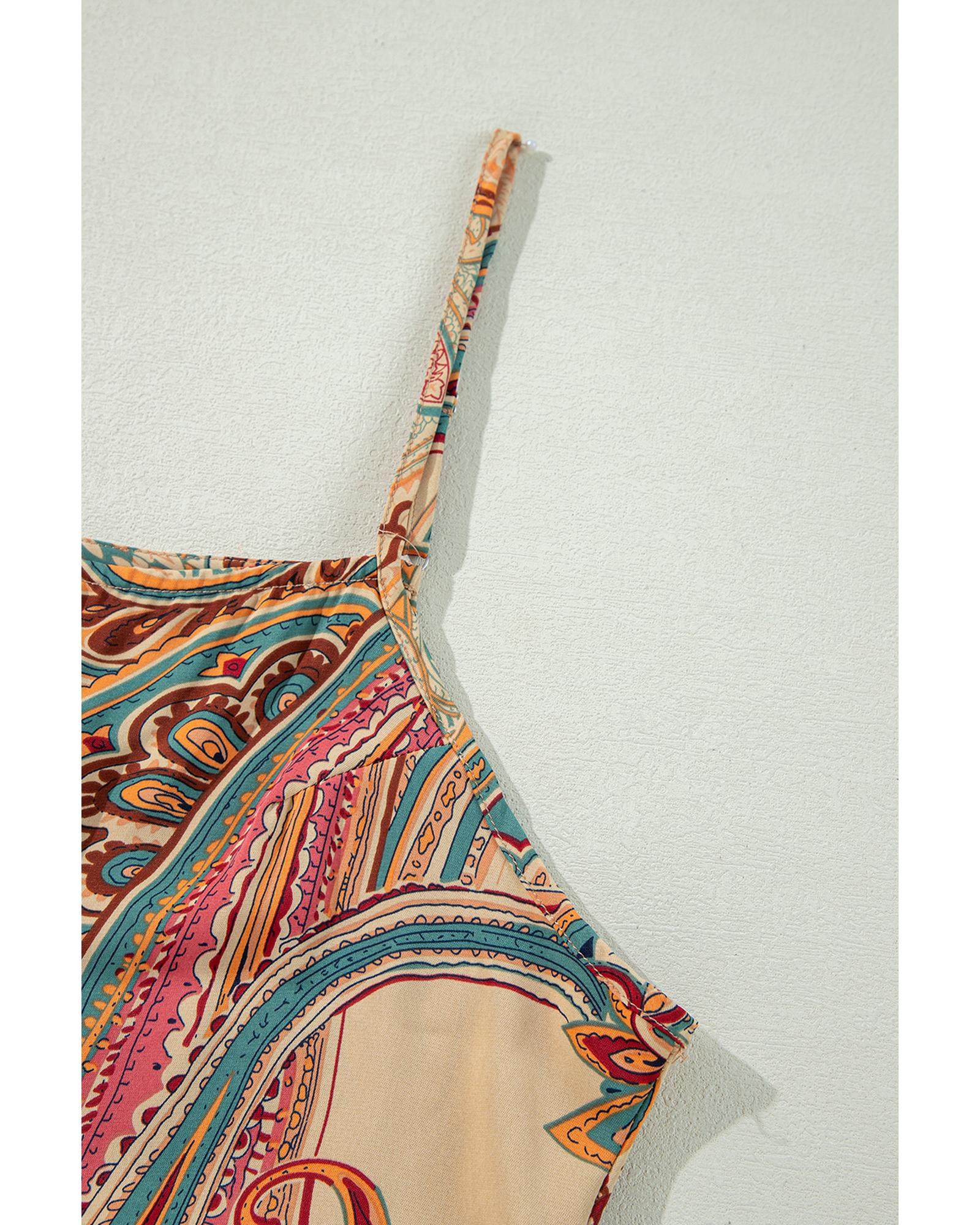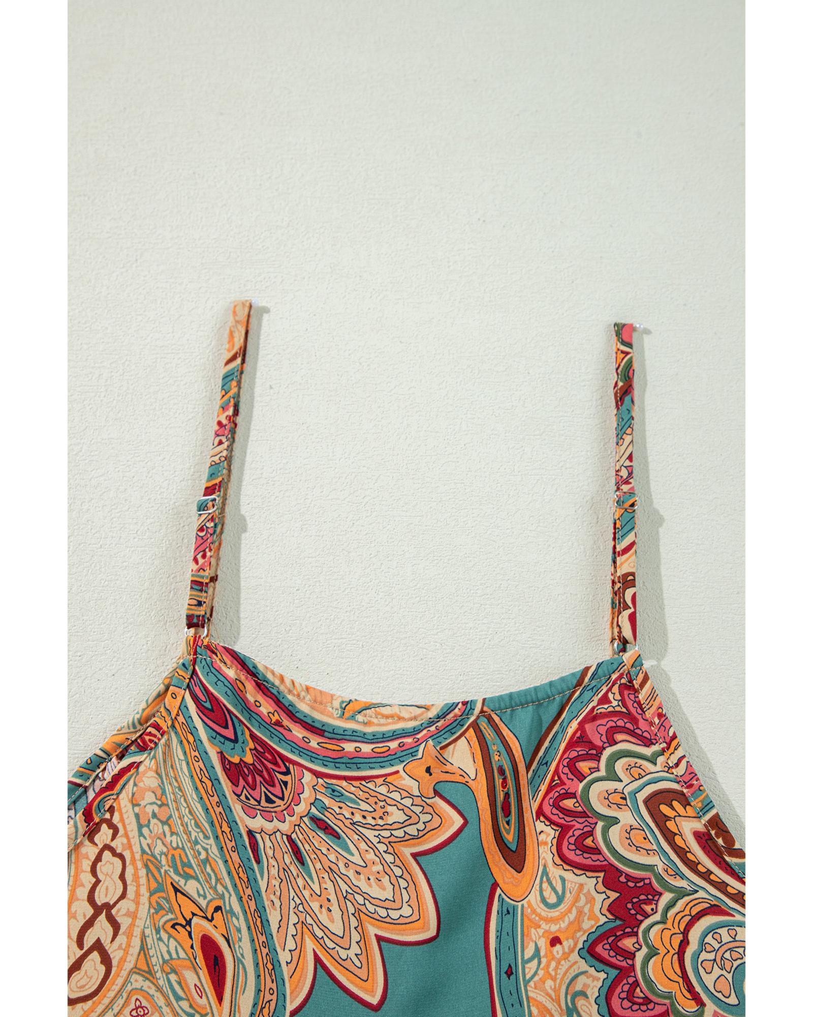 Features a vibrant paisley print with intricate detailing for a stylish, eye-catching look. Designed with delicate spaghetti straps that offer a graceful and feminine silhouette. Wide leg cut provides comfortable movement and a flattering fit. Perfect for casual outings or dressy occasions when paired with sandals and accessories