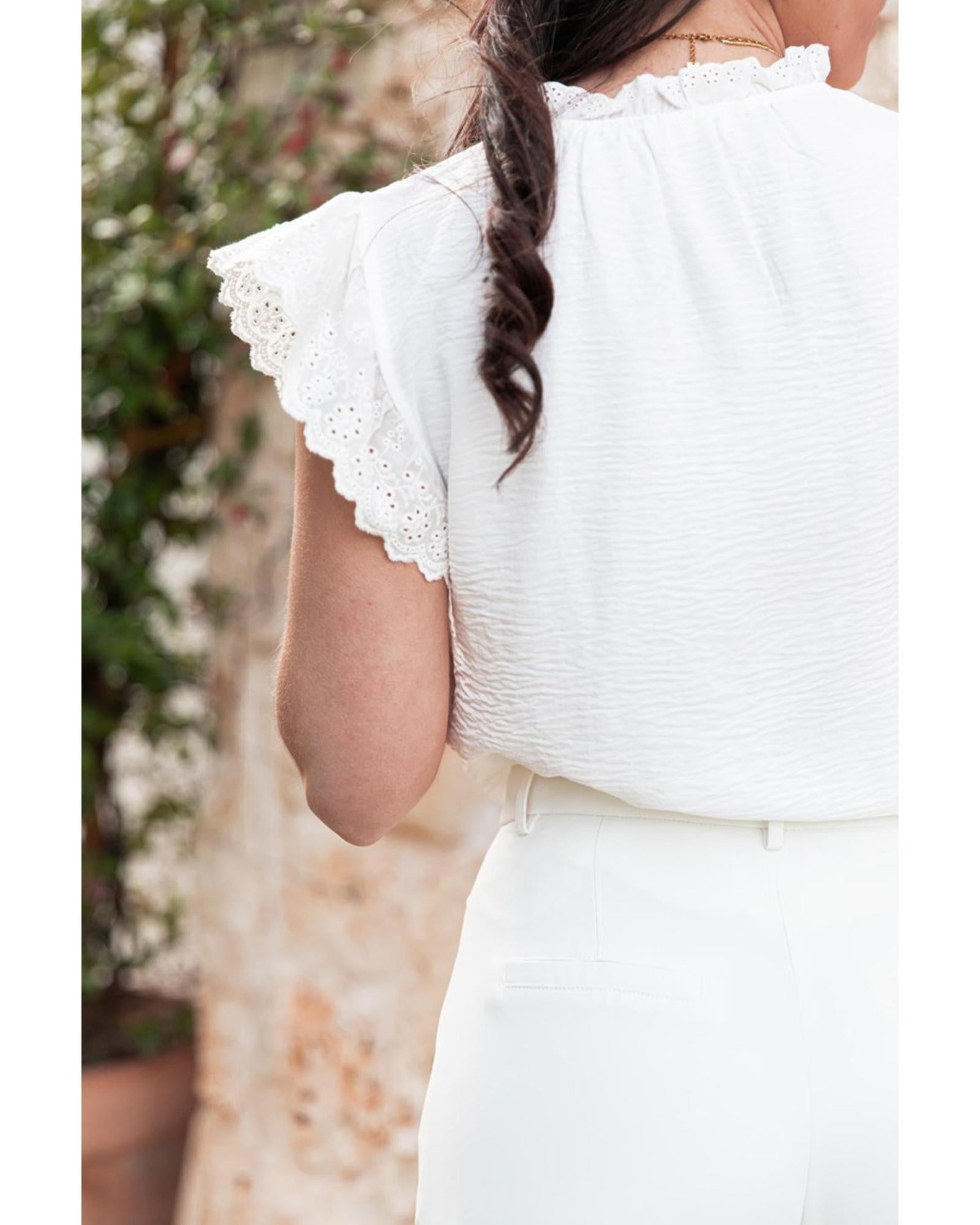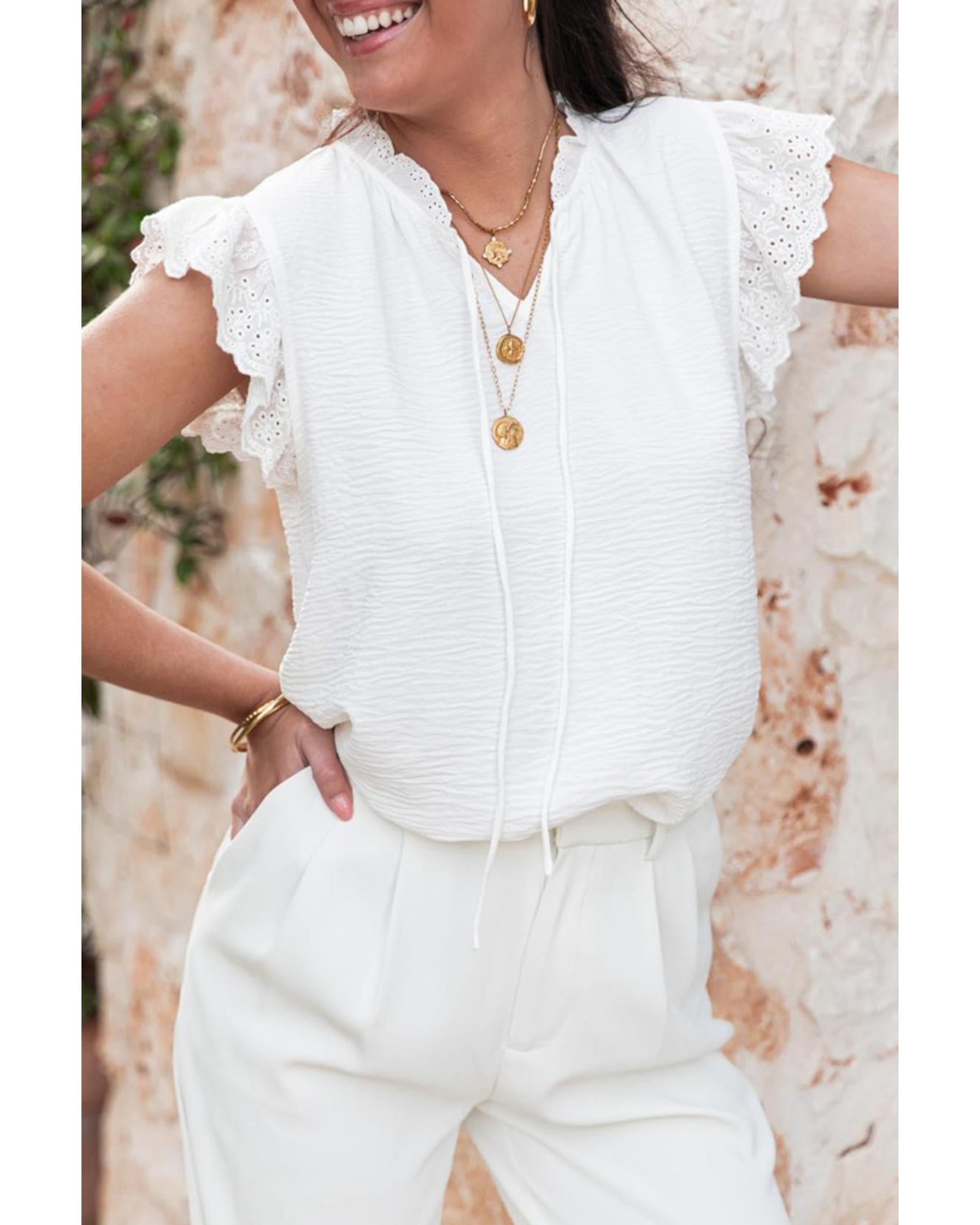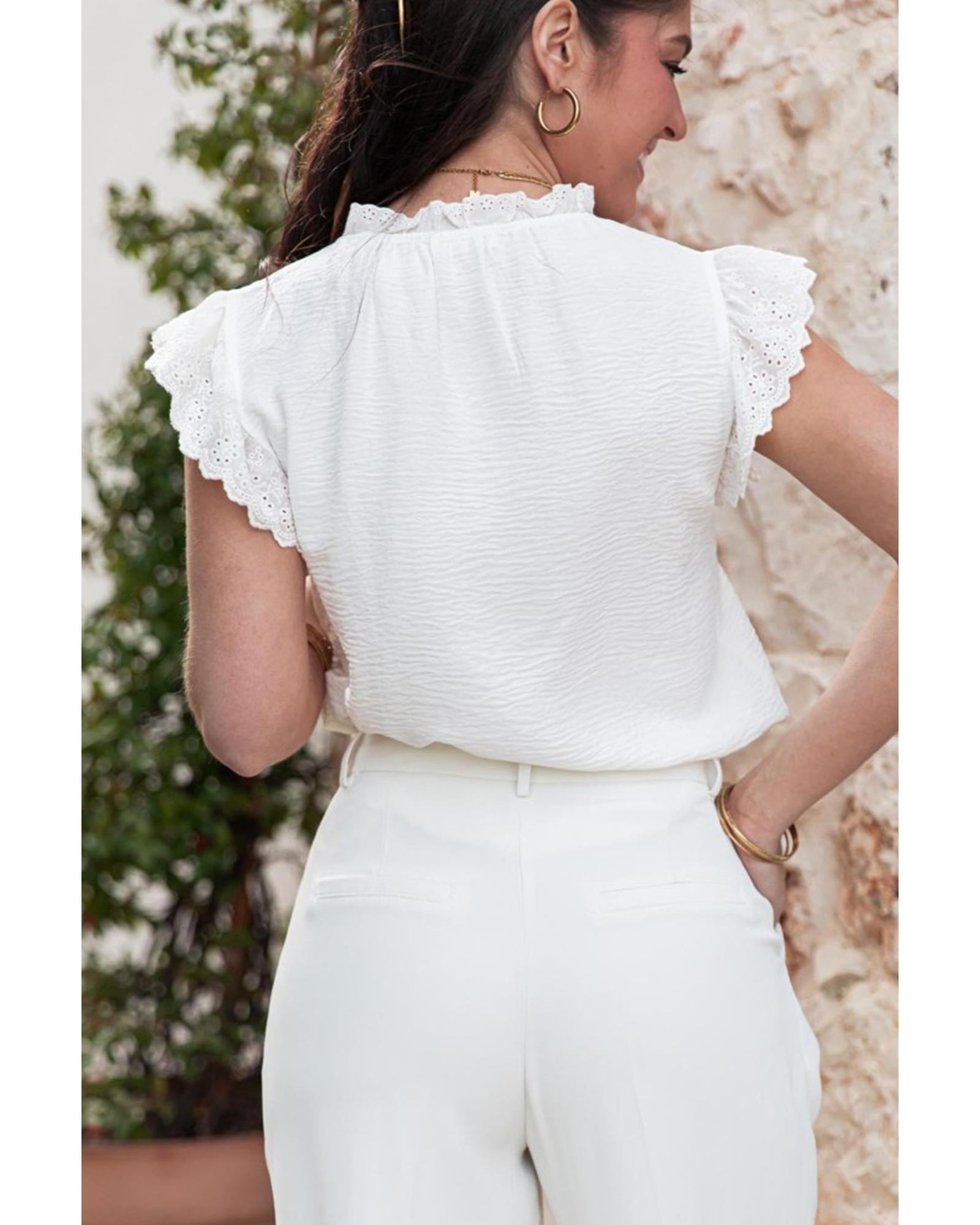 This blouse features delicate embroidery and a ruffle trim that enhance its elegant, feminine appeal. Crafted from textured fabric, it adds visual interest and a pleasant feel. Made of 100% polyester, it offers comfort and easy care. Versatile enough to pair with pants or skirts for both casual and dressy looks.