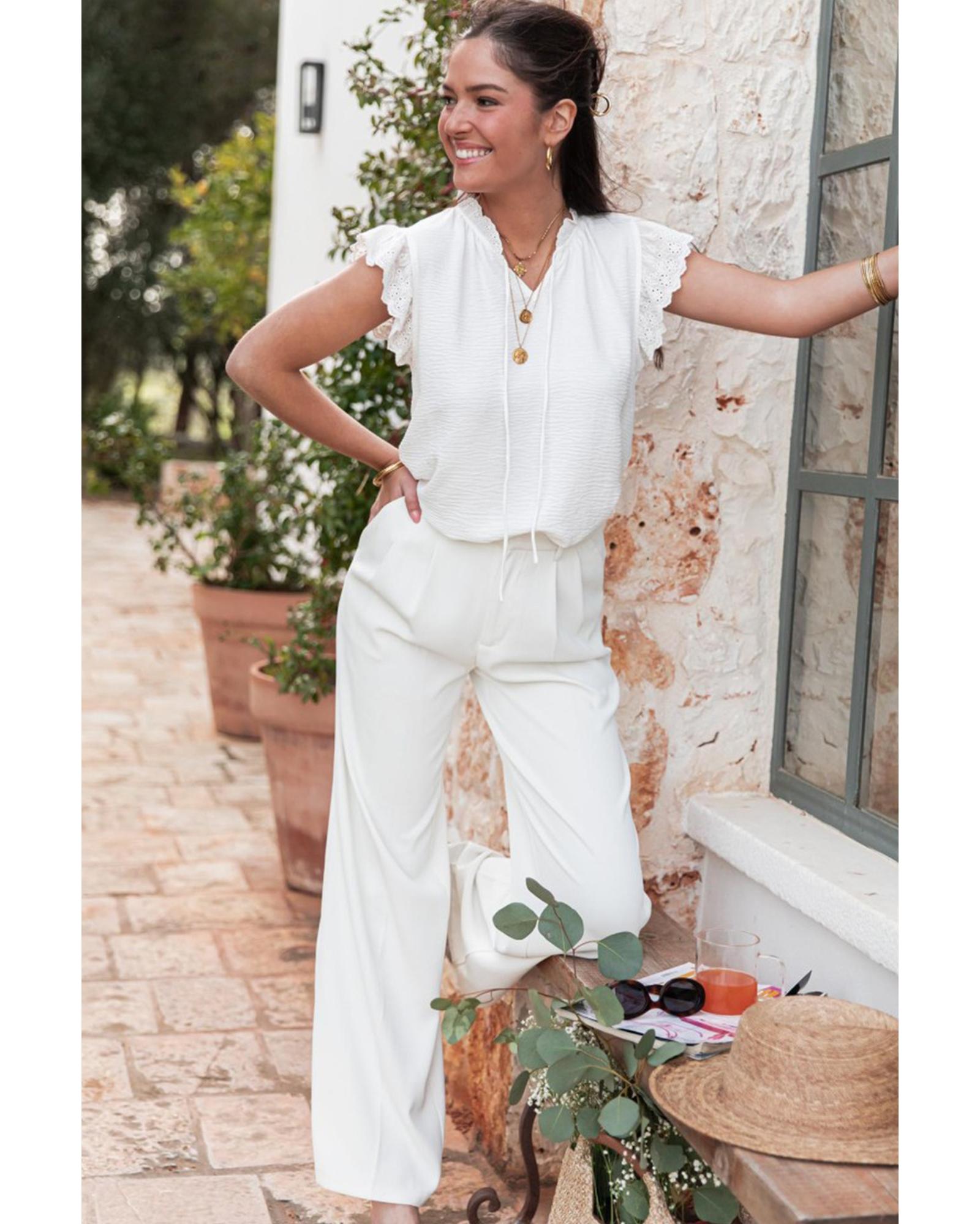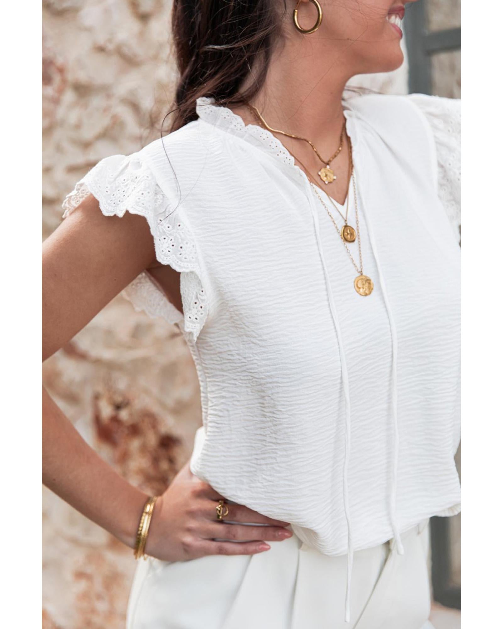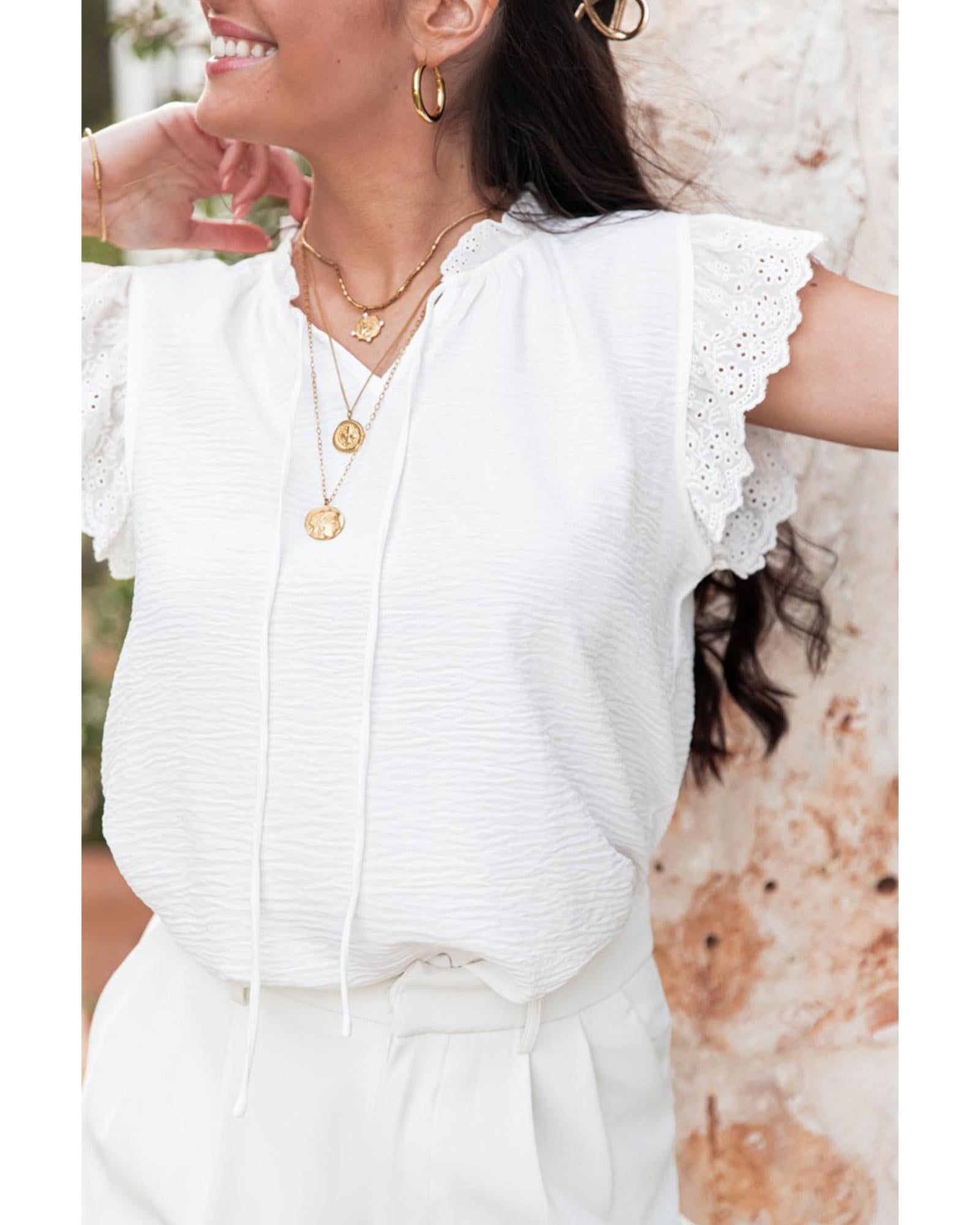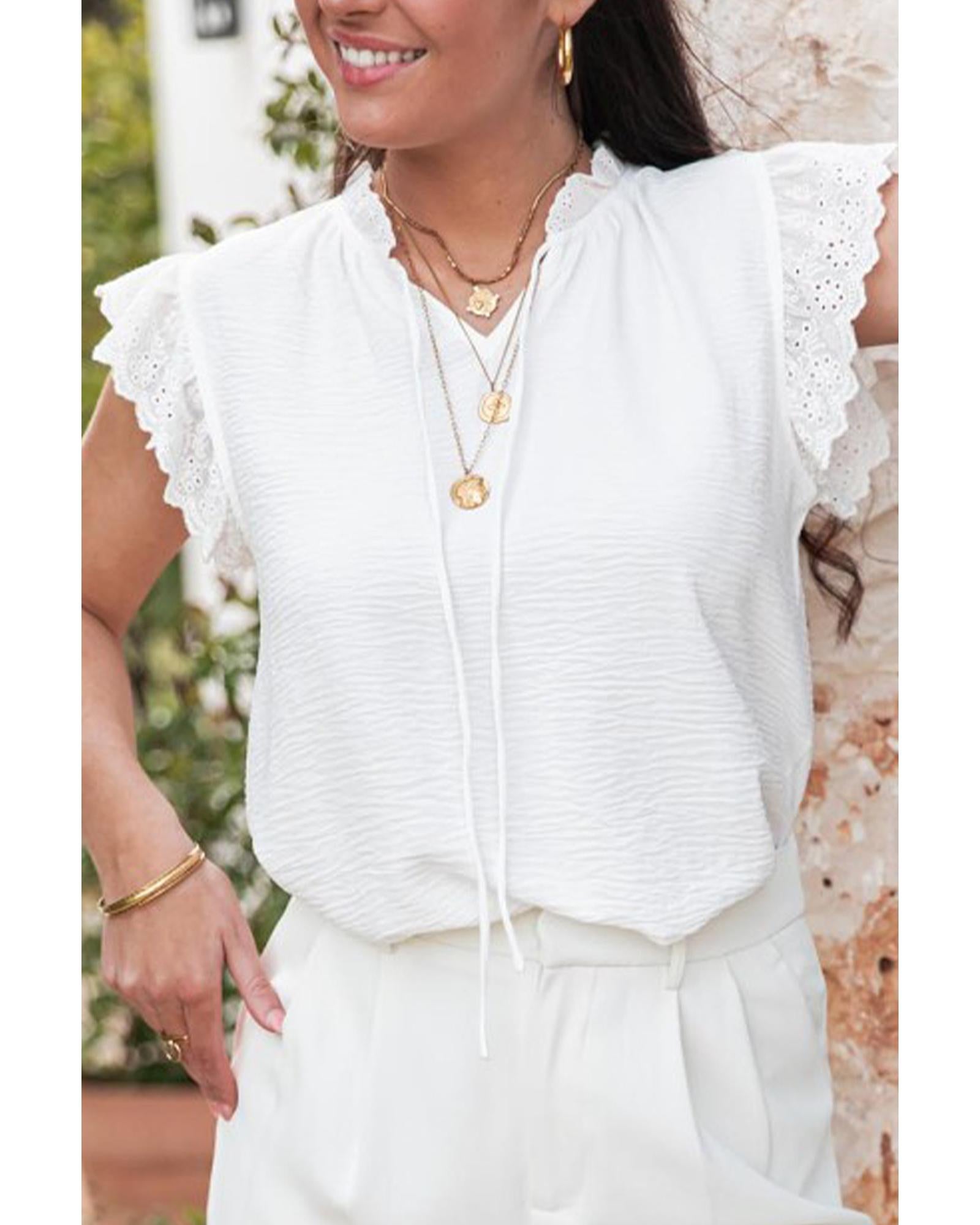 This blouse features delicate embroidery and a ruffle trim that enhance its elegant, feminine appeal. Crafted from textured fabric, it adds visual interest and a pleasant feel. Made of 100% polyester, it offers comfort and easy care. Versatile enough to pair with pants or skirts for both casual and dressy looks.