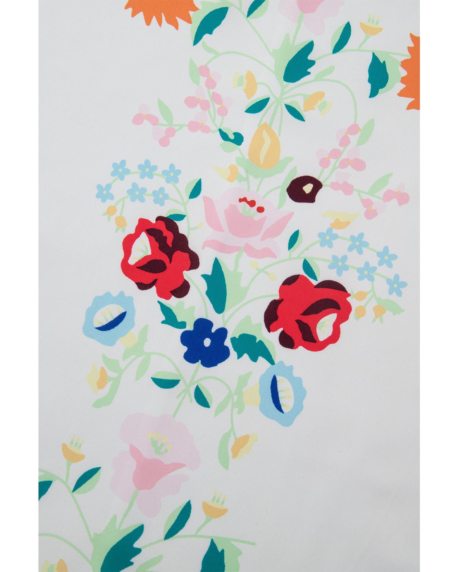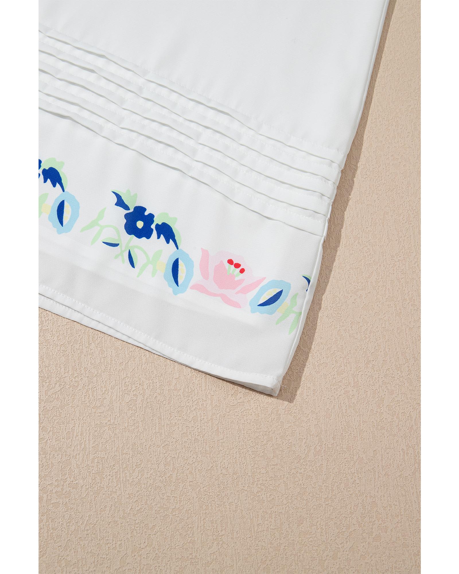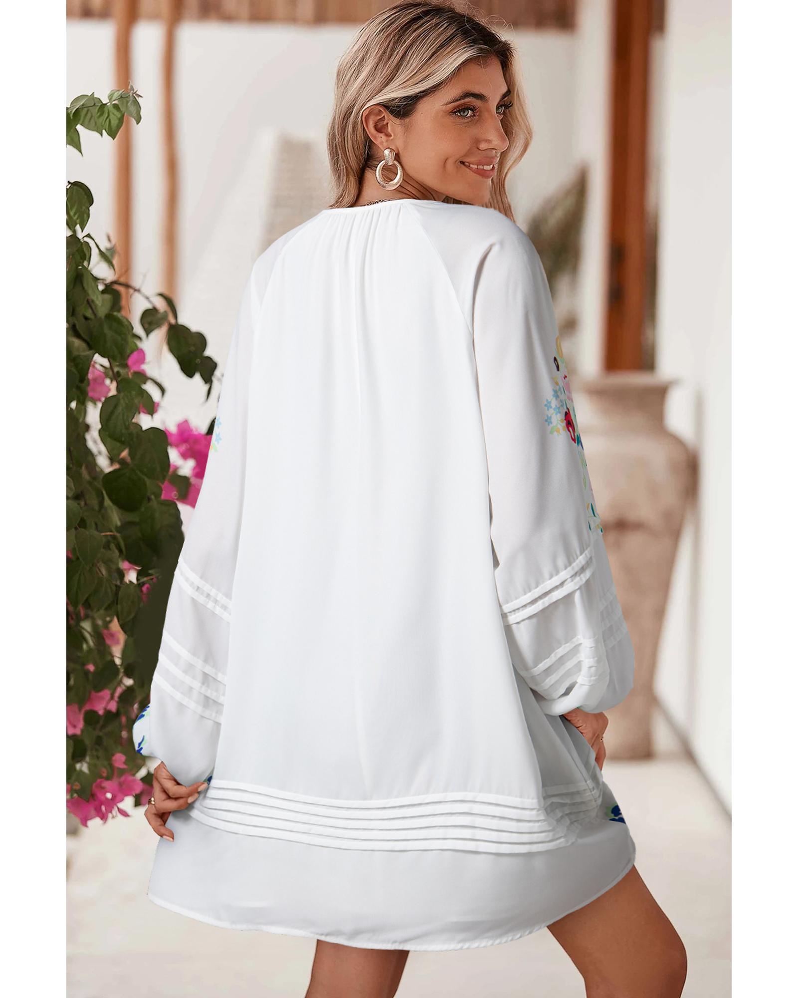 White Floral Print Boho Tassel Tie Split Neck Tucking Detail Puff Sleeve Mini Dress - L