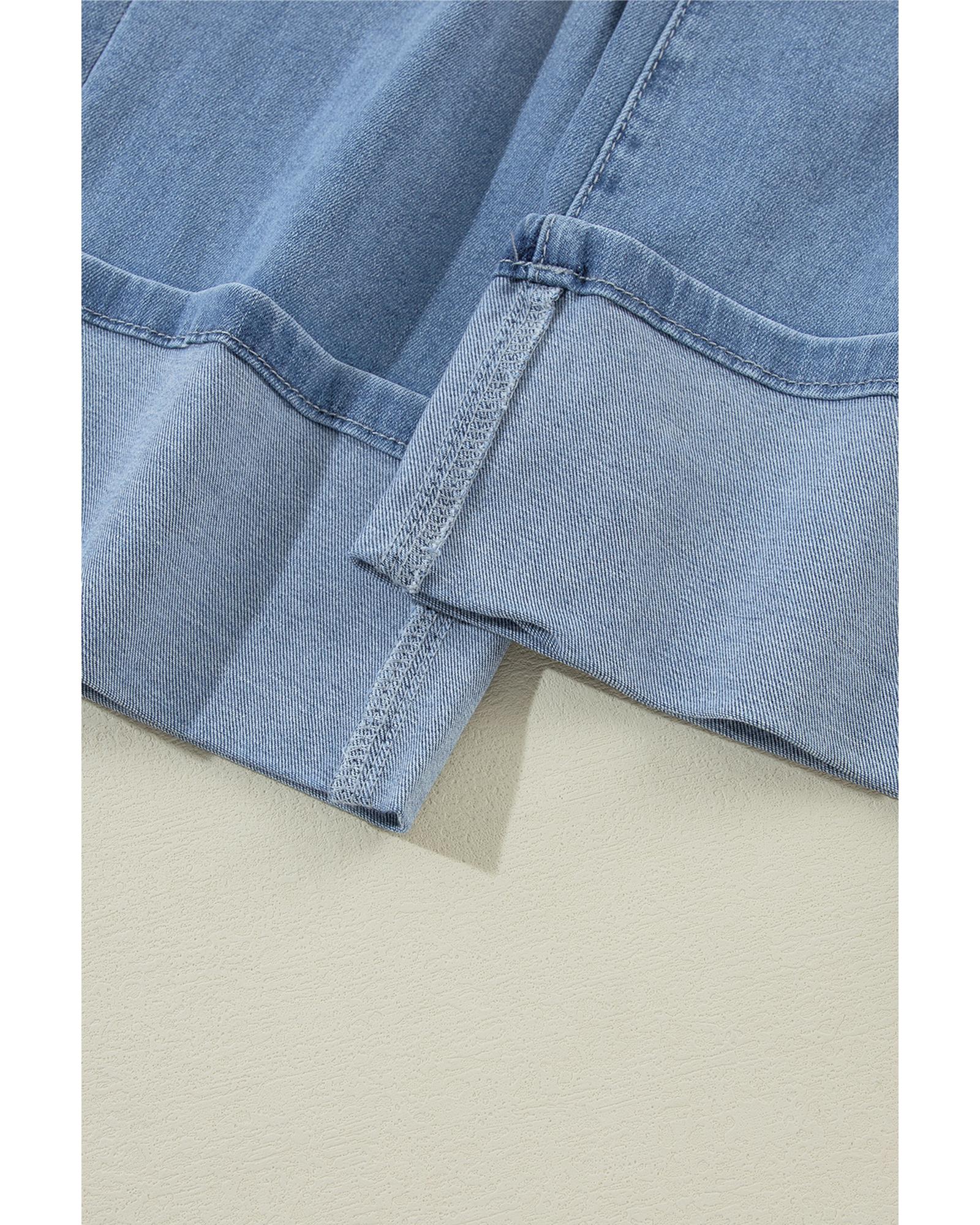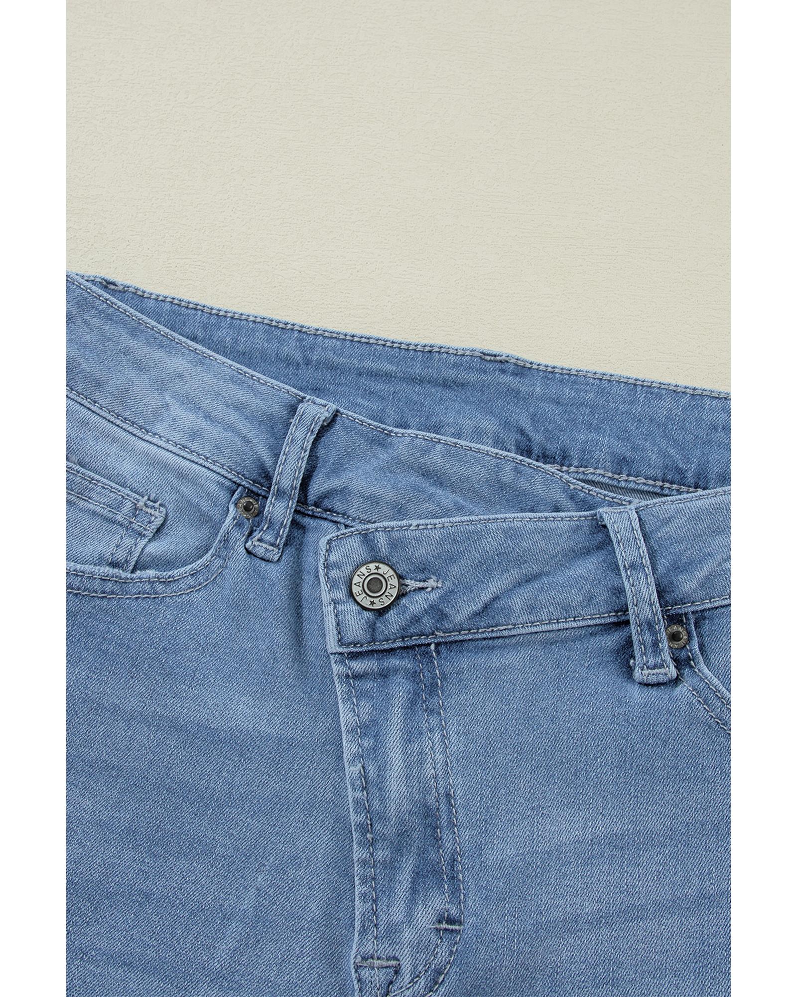 These high-rise jeans feature a loose straight fit and a unique asymmetric button and zip design. With ripped detailing and a crossover waist, they offer a stylish, modern look that pairs well with any top.
